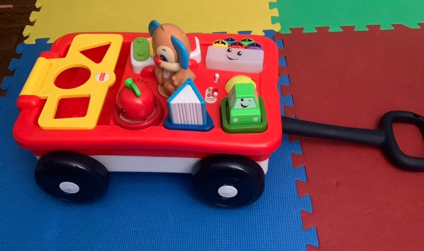 A red wagon with a variety of interactive features and toys. The wagon has wheels and a handle that allows it to be pulled around. The wagon also has a variety of interactive elements, such as a shape sorter, a spinning apple, and a musical phone.