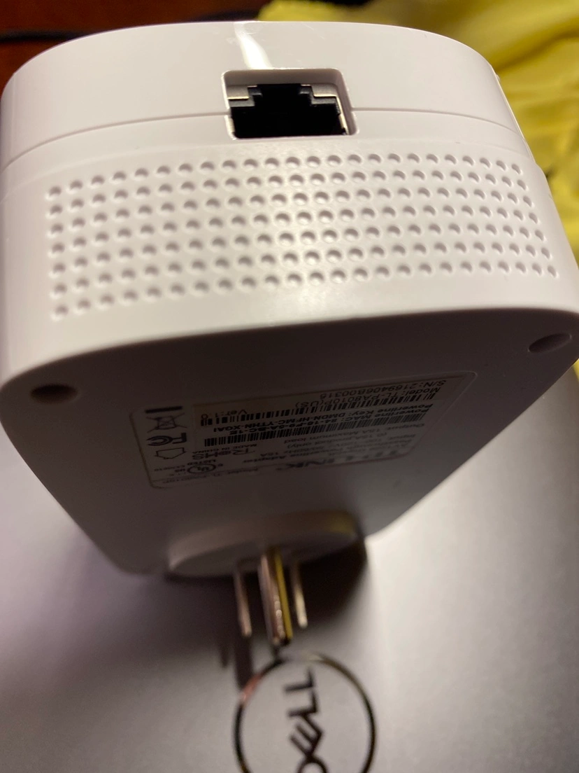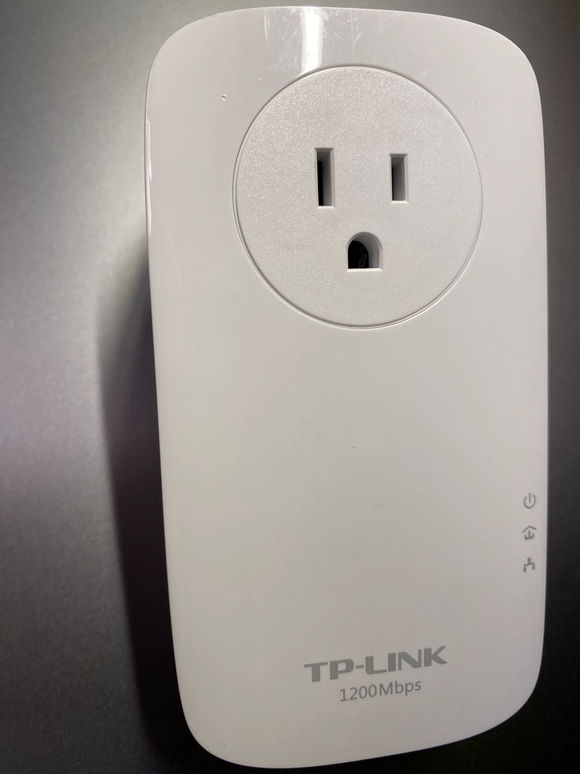 A white TP-Link Wi-Fi range extender. It has an outlet and an ethernet port.