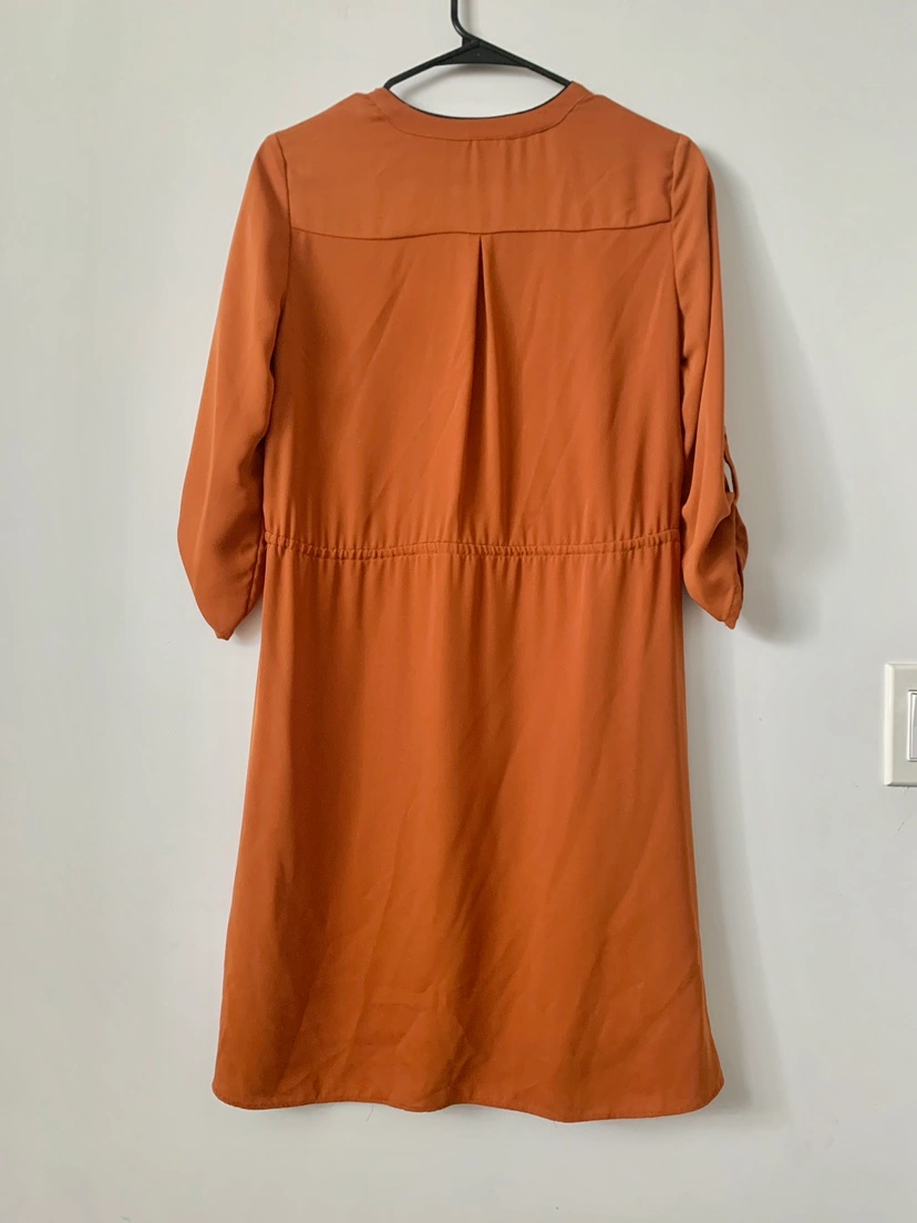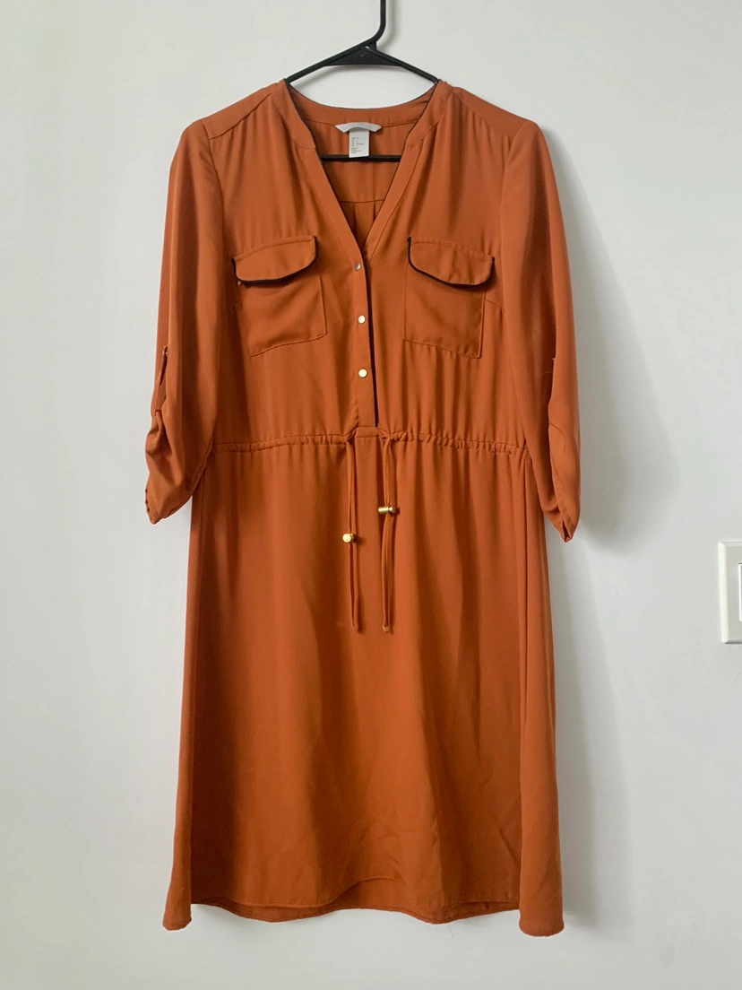 Selling this because this isn’t my style anymore and I can’t exactly fit into it comfortably. The tag is cut but it hasn’t been worn at all. Bought it for $35 at H&M in 2019 before H&M started making “recycled clothes” this is really good quality even if you wash it. It’s perfect for night out or work clothes. (A rust orange H&M dress with 3/4 sleeves, a button up front, and a drawstring waist.) ‼️NO TRADE‼️✨firm pricing✨ ✨pick up at Wellesley subway station or at my condo building✨will be confirmed in detail