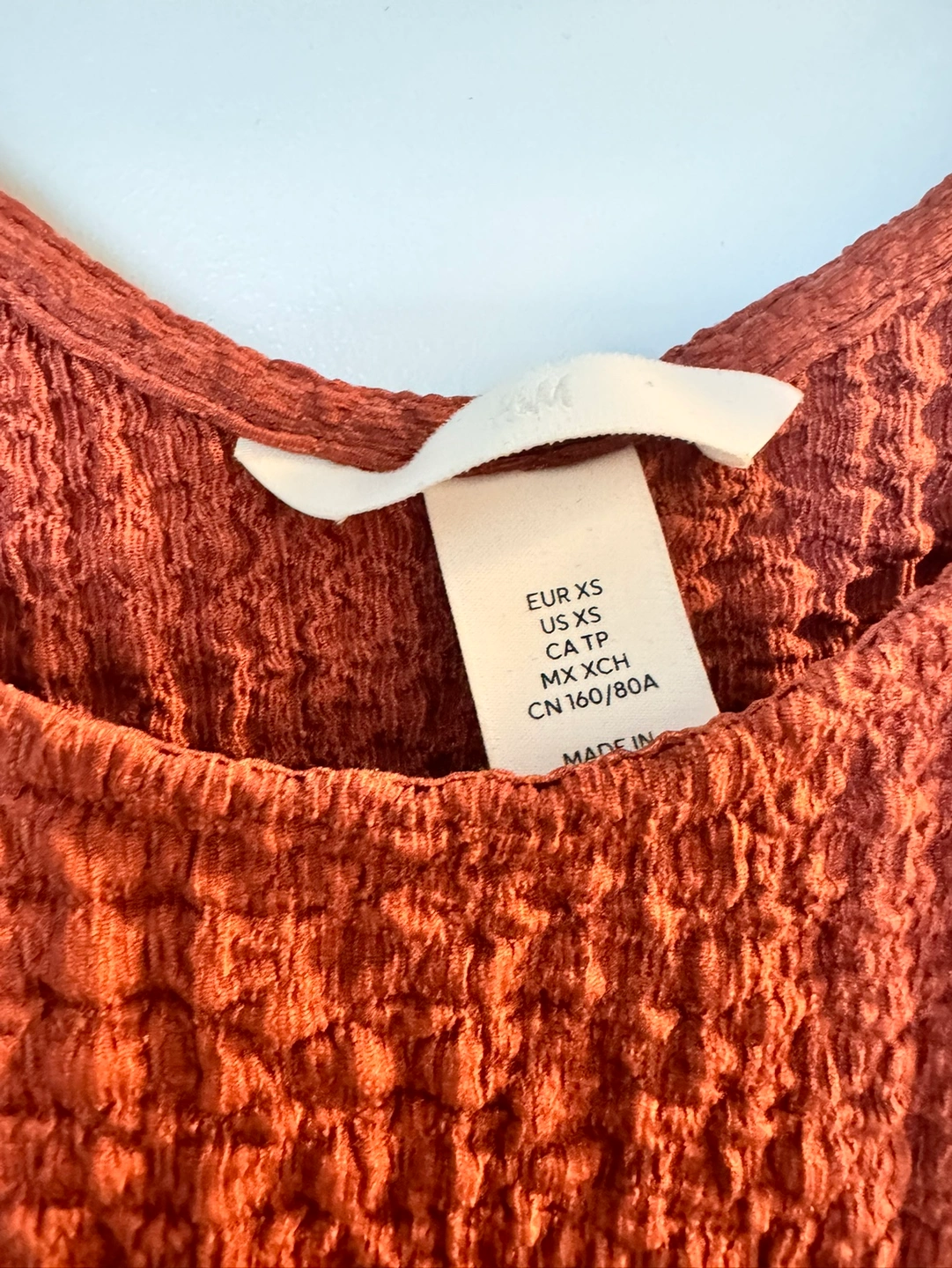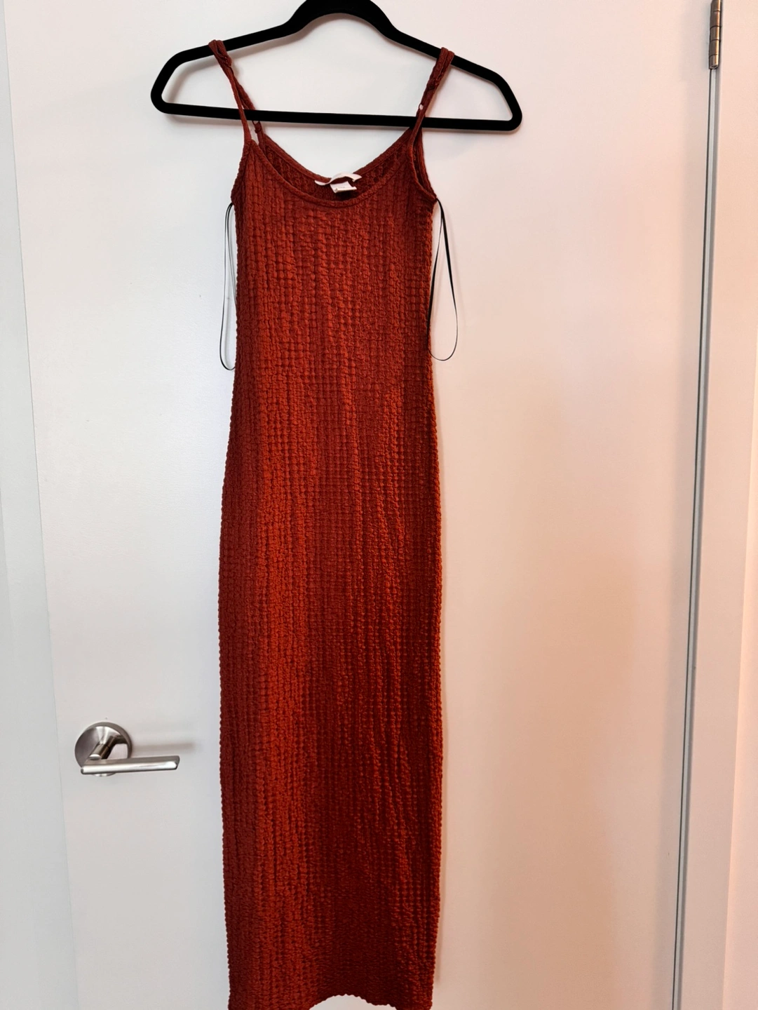 This is a cute and comfy midi dress perfect for summer or fall. The fabric is soft and textured, and the colour is a beautiful orange. It has thin straps and a flattering fit. It is a great option for a casual or dressy occasion.