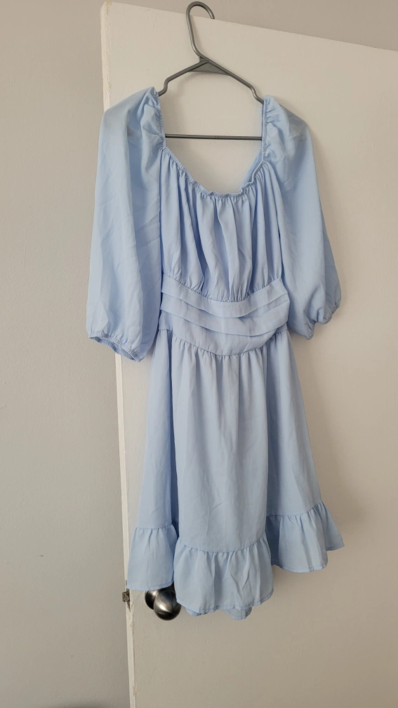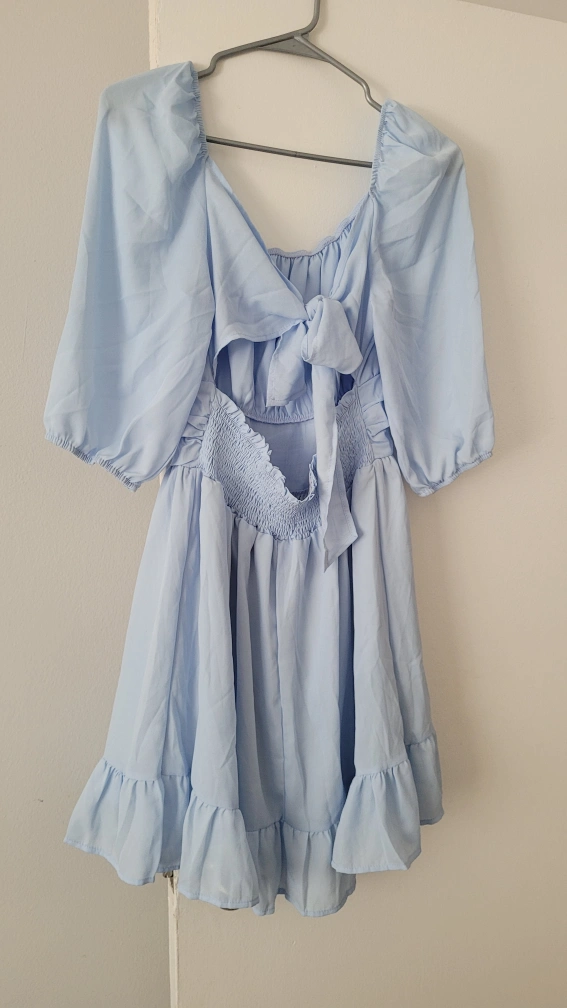 Light blue dress with a tie at the back. Ruffled hem and puff sleeves.