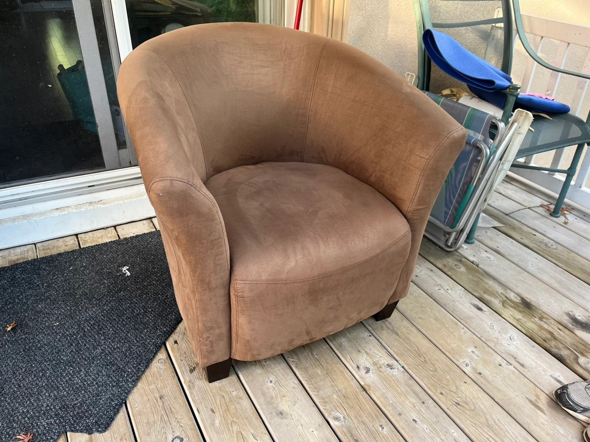 I have two comfortable, stylish chairs that would be perfect for a living room or bedroom. It is in good condition and features a brown, suede-like fabric with dark wood legs. No defects. It is easy to clean and has a classic design. $75 each. Pick up near Yonge and set Clair our delivery is available for $10 within 2 km.