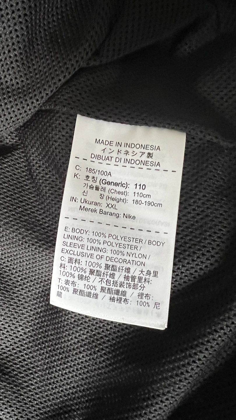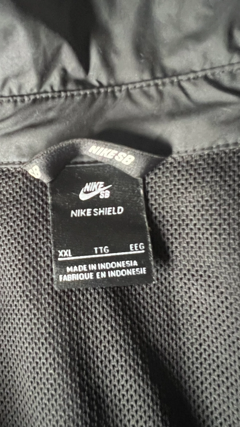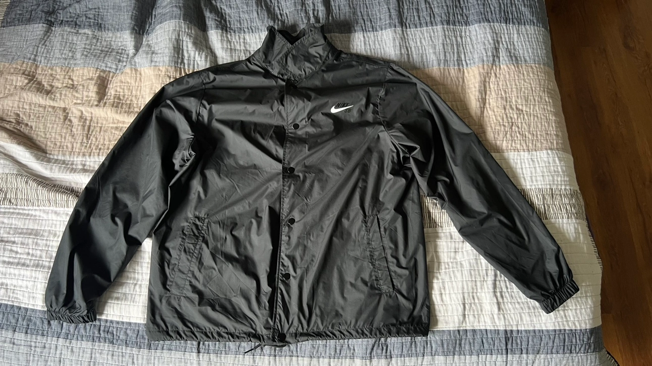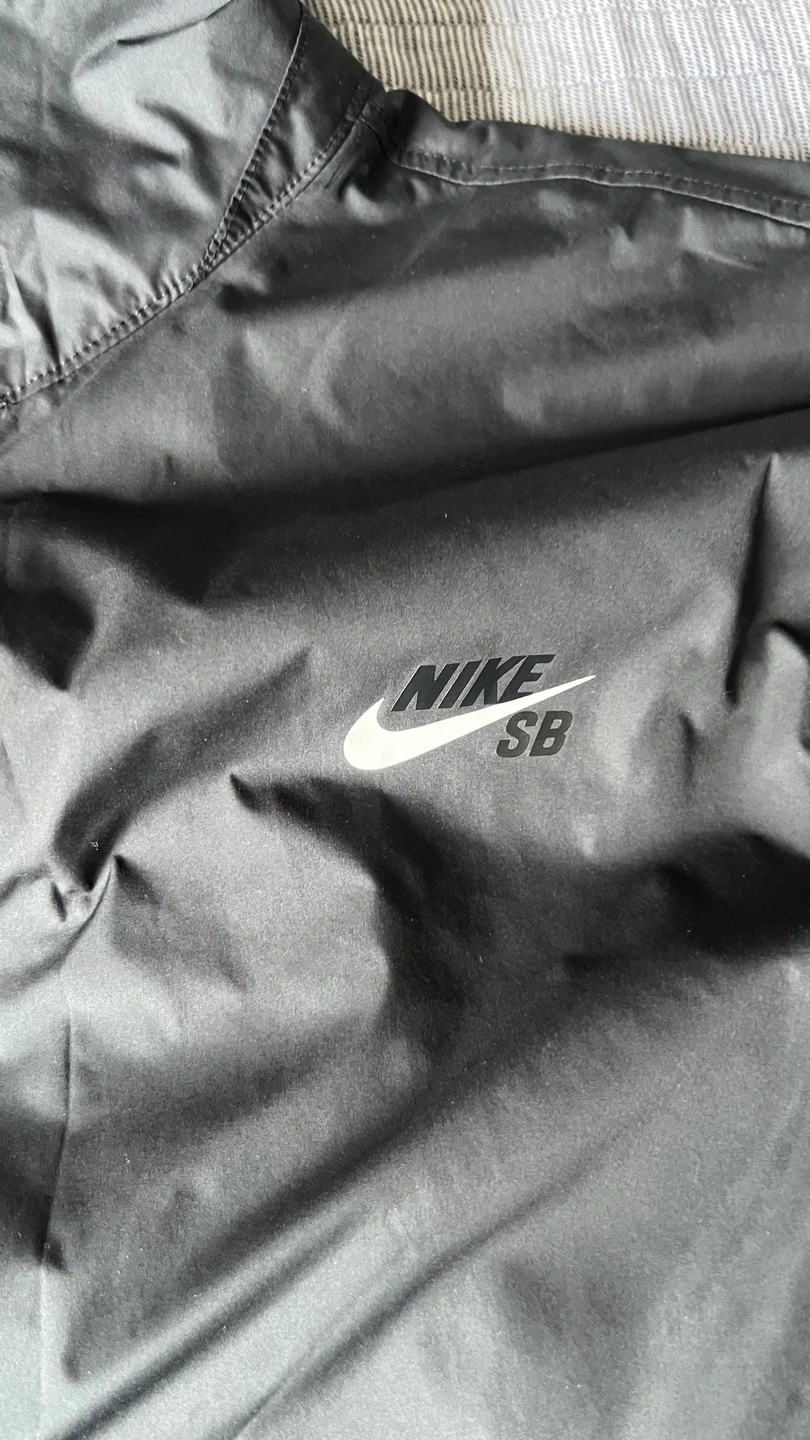 Black Nike SB Coaches Jacket. Features a zipper and snap button closure. Two pockets on the front and one on the inside. The jacket also has a drawstring hood and an elastic waistband.