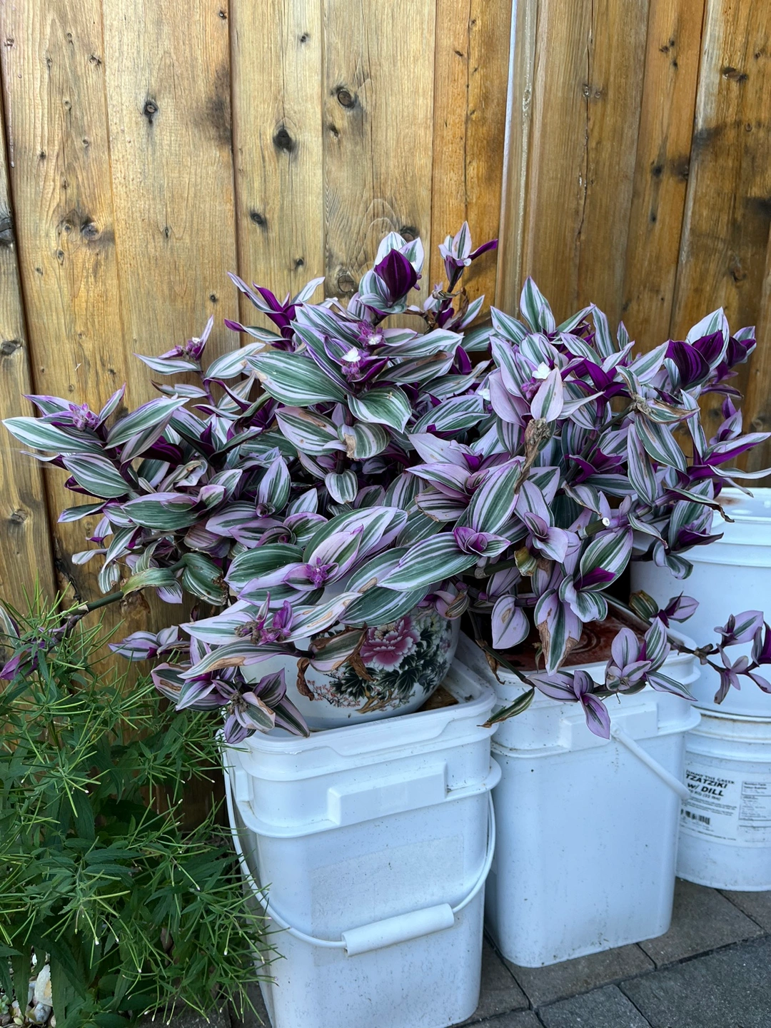 A large, healthy Wandering Jew plant in a ceramic pot.