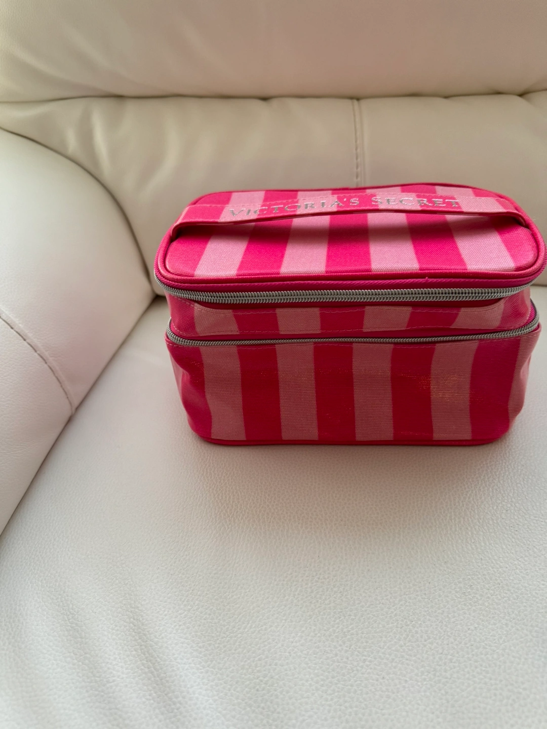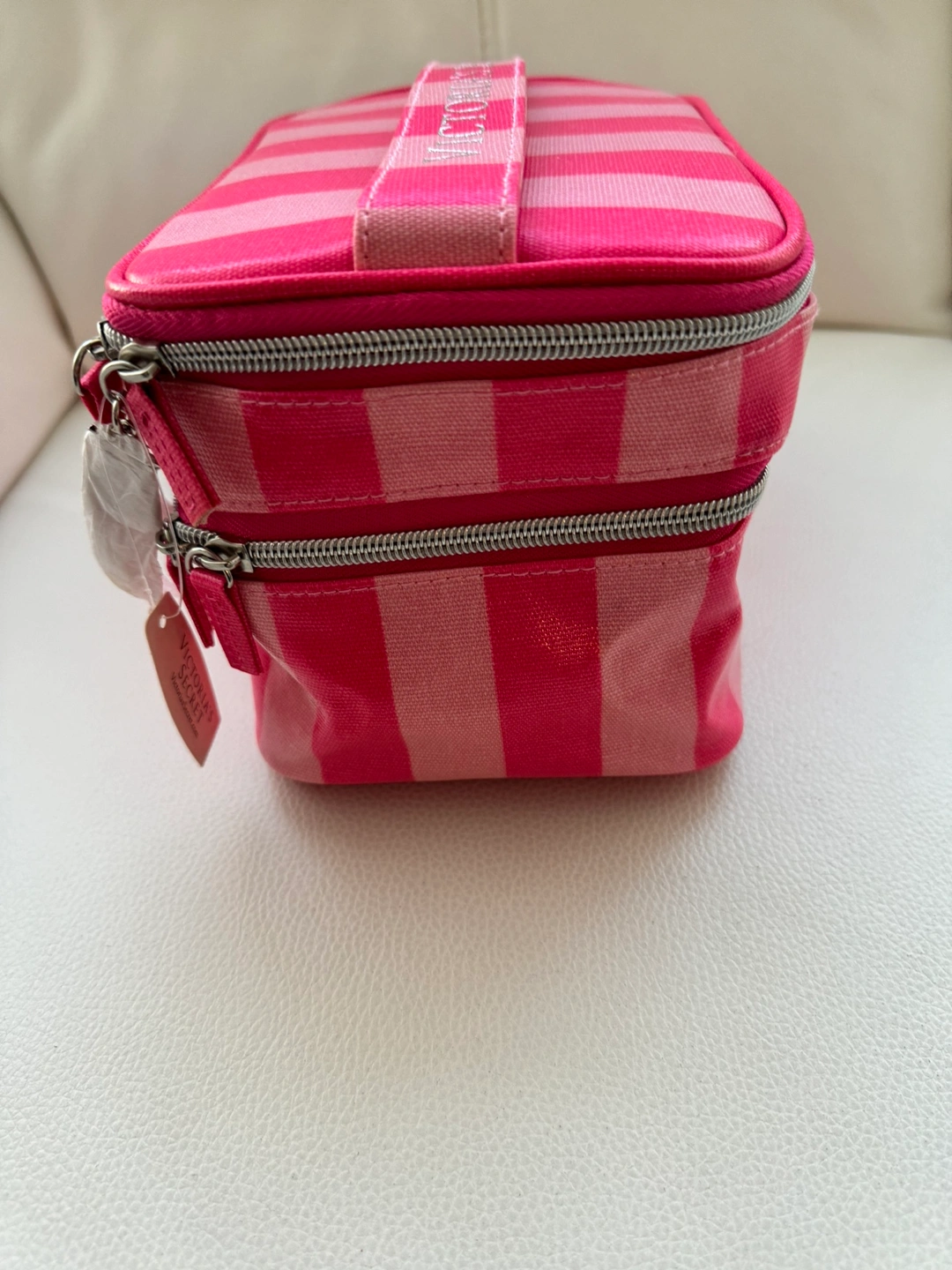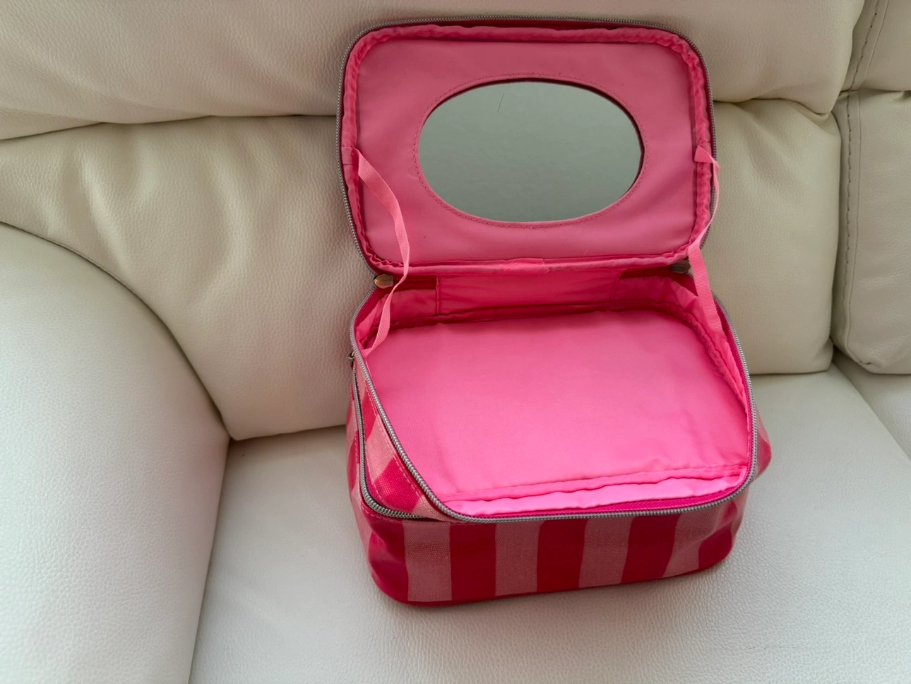 Pink striped makeup bag/ kit with a mirror and zipper closure. Features a handle on the top. New, never used. Pick up at Steeles/Bathurst North York.