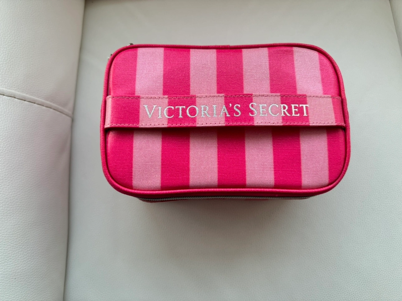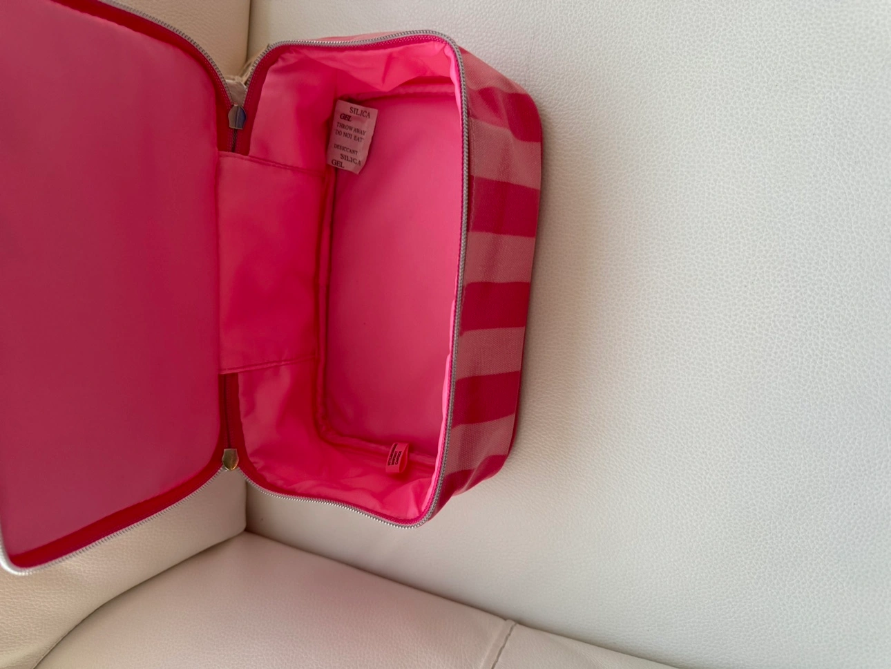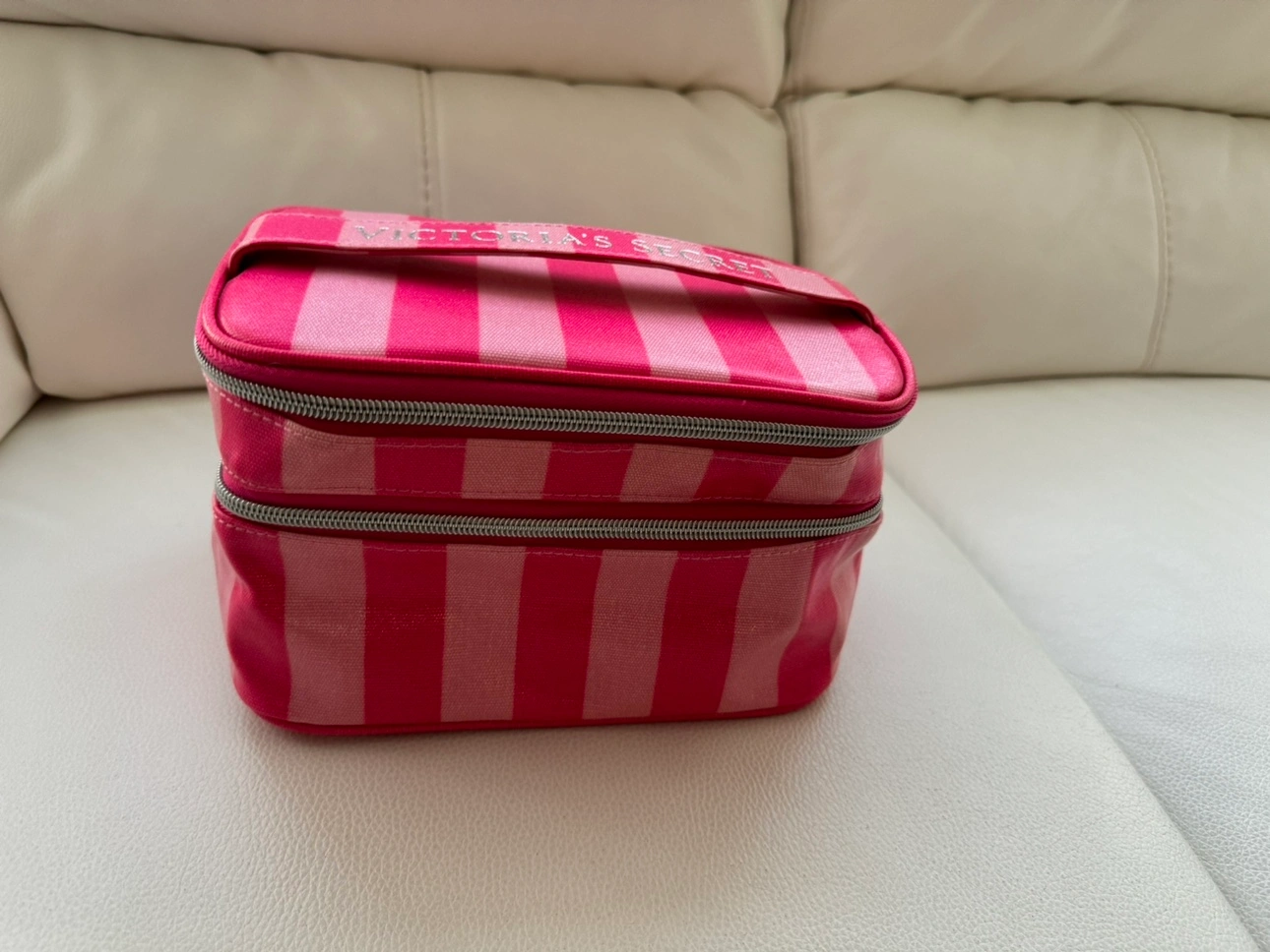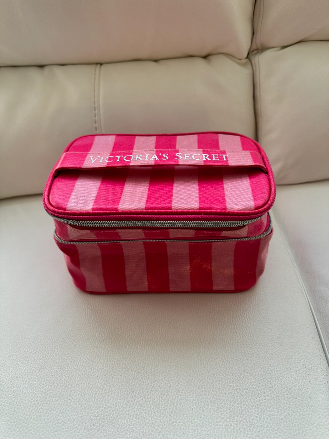 Pink striped makeup bag/ kit with a mirror and zipper closure. Features a handle on the top. New, never used. Pick up at Steeles/Bathurst North York.