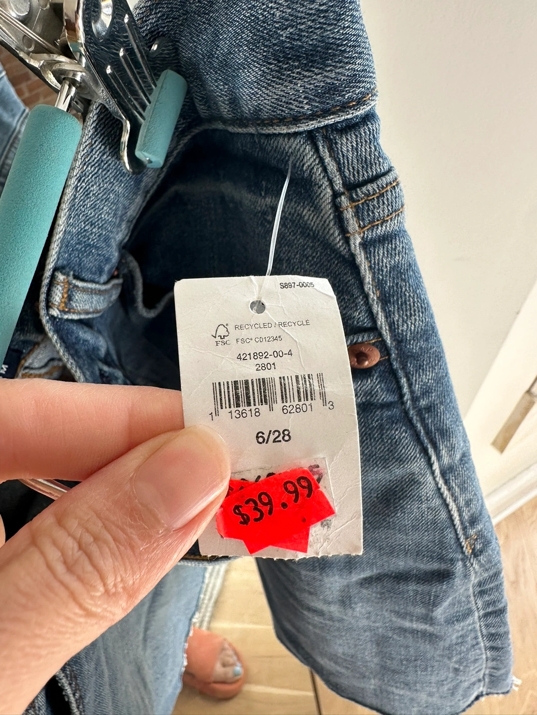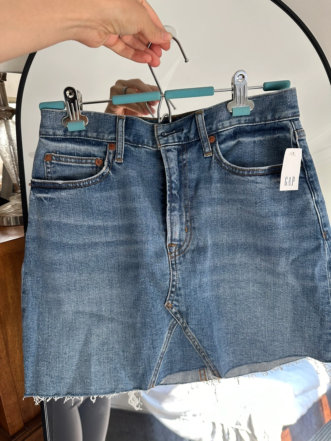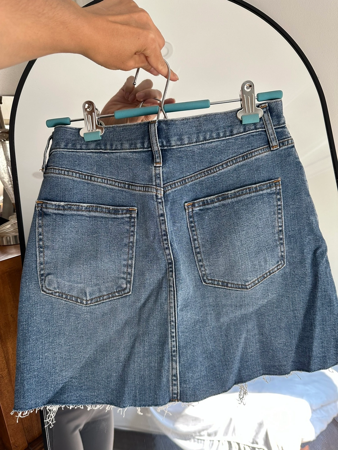 Blue denim skirt with frayed hem. Size 28. High rise. Five pocket style. Button and zipper closure. Made with recycled denim.