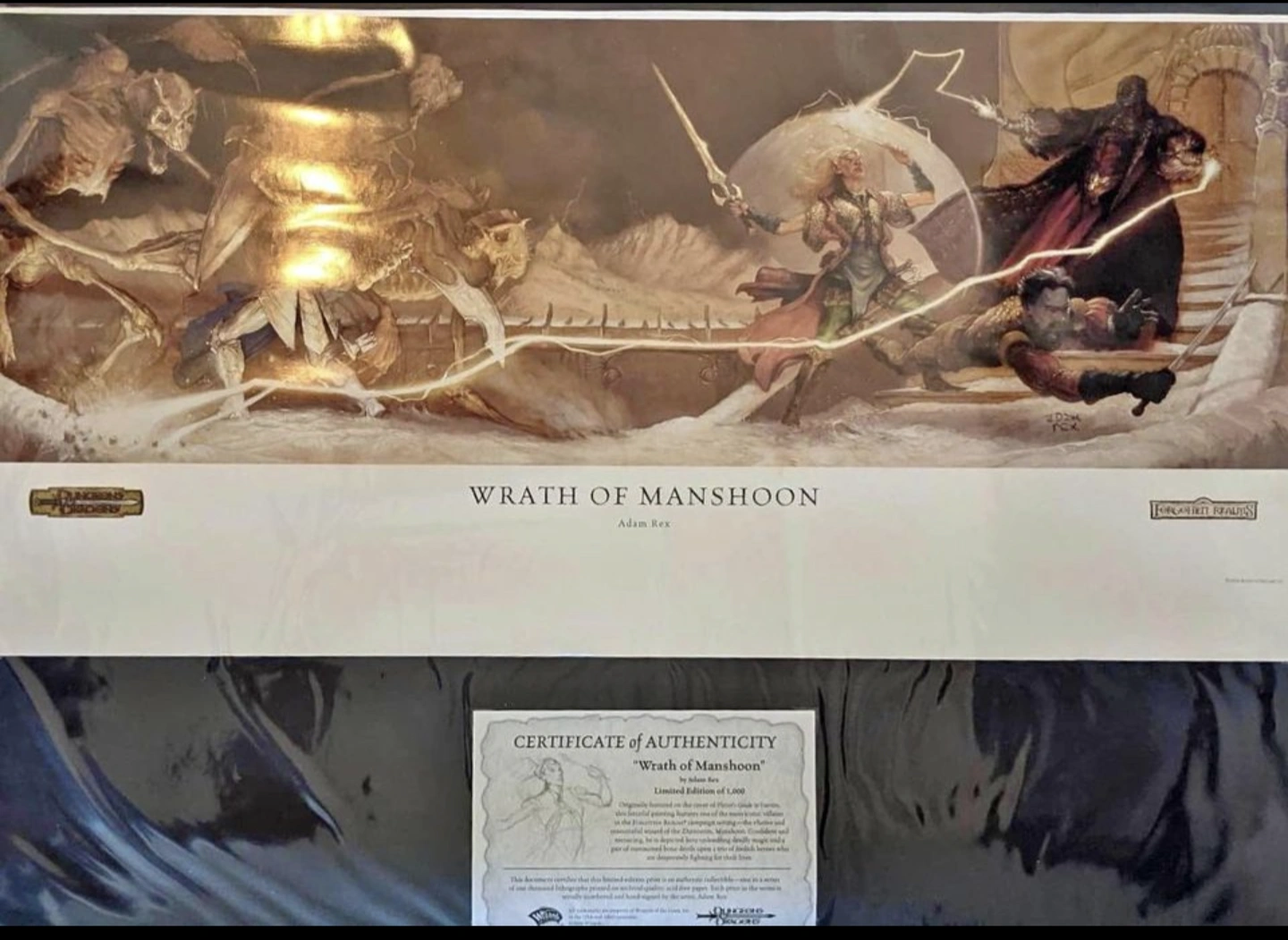 Wrath of Manshoon by Adam Rex Limited Edition Dungeons and Dragons Art Print Cover of Players Guide to Faerun "Originally featured on the cover of Player's Guide to Faerún, this forceful painting features one of the most iconic villains in the FORGOTTEN REALMS campaign setting-the elusive and resourceful wizard of the Zhentarim, Manshoon. Confident and menacing, he is depicted here unleashing deadly magic and a pair of summoned bone devils upon a trio of foolish heroes who are desperately fighting for their lives." "Adam Rex is the author and illustrator of more than forty books for kids. These include New York Times bestselling picture books like Frankenstein Makes a Sandwich and School’s First Day of School, (with illustrator Christian Robinson). His work has been adapted for film and television. He’s won some awards, including the Margaret Wise Brown Prize in Children’s Literature and the National Cartoonists Society Book Illustration Award. His debut novel was shortlisted for the Andre Norton Award for Young Adult Science Fiction and Fantasy. He used to make art for games like Dungeons & Dragons and Magic: The Gathering. Sometimes he still does. He lives in Tucson, Arizona, with his dog, son, and wife."