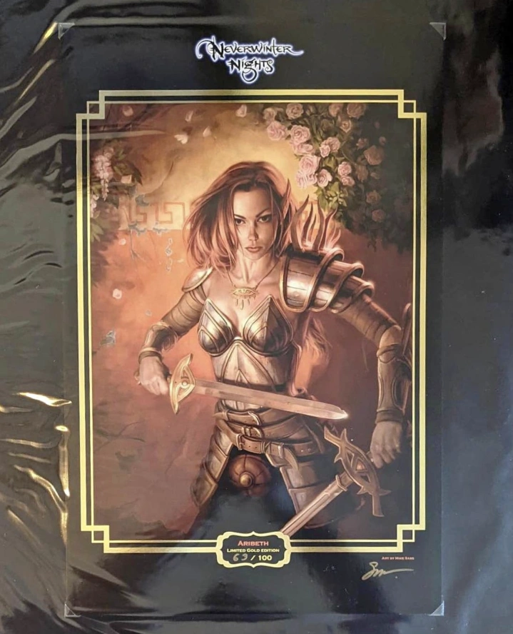 Dungeons and Dragons: Aribeth by Mike Sass Official BioWare Artist for Neverwinter Nights 63/100 Limited Edition Gold Foil Print 17" x 11" "A pioneer in the video games industry, Mike previously had a long career as legendary developer BioWare's first artist, and for 12 years illustrated for some of the top RPG video games of all time. Mike's experience at BioWare creating box art, magazine covers, concept art and marketing illustrations allowed him to seamlessly transition in 2009 to pursue his true passion of fantasy illustration and oil painting. As a freelance artist, Mike has illustrated RPG and card art for the gaming industry's top franchises, including Magic the Gathering, Hearthstone, Star Wars, Pathfinder and Dungeons and Dragons. As one of a rare few gaming artists who paints in traditional media, Mike combines commercial art with his love for the craft of painting. Mike's work has appeared in the Spectrum annual, as well as featured in magazines such as ImagineFX and Fantasy Art (China). Recently, Mike's success in painting traditionally has led to exhibiting in 2013 and 2014 at the Allentown Art Museum in the Illuxcon salon. Illuxcon is an annual juried celebration of the best in imaginative realist art. Additionally, in 2014, Mike was a finalist for the prestigious International ARC Salon Competition in the imaginative realism category. In 2018, Mike released a large, 2-disc DVD on his painting techniques, available through his site, select stores and on Amazon Prime video."