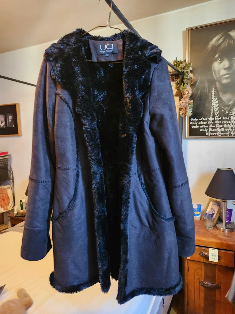 Black faux fur coat with a hood, two front pockets, and a single button closure. The coat is lined with a soft black fur. The size is P/S. The coat has some wear and tear.