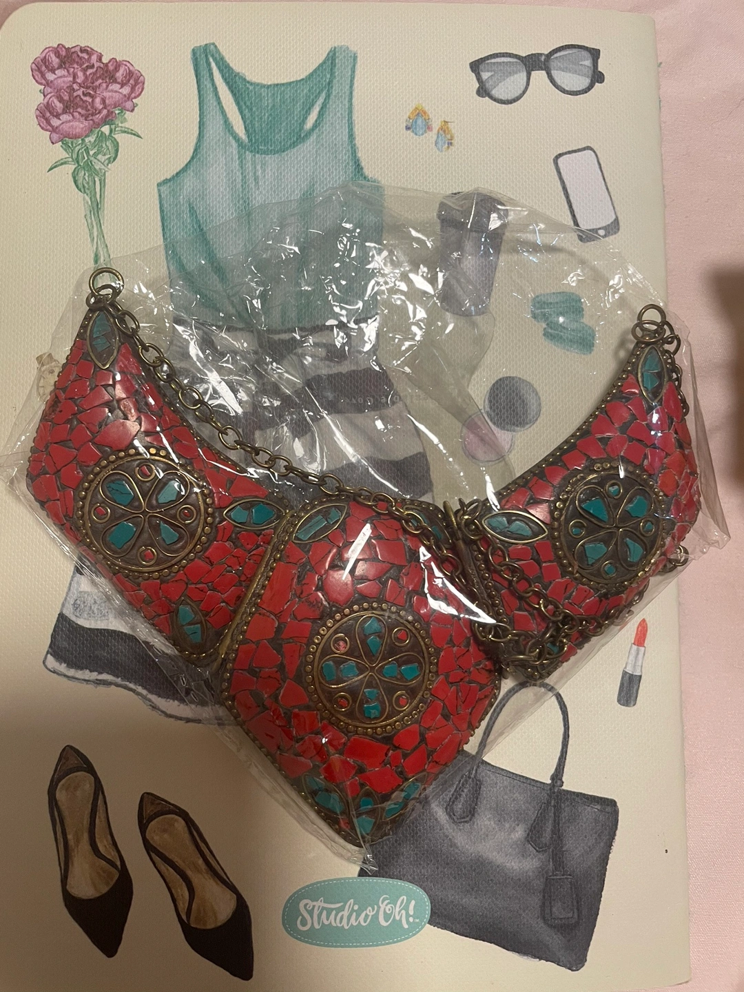 A beautiful statement necklace with red and turquoise stones. It is perfect for adding a touch of colour and style to any outfit. Brand new in package.