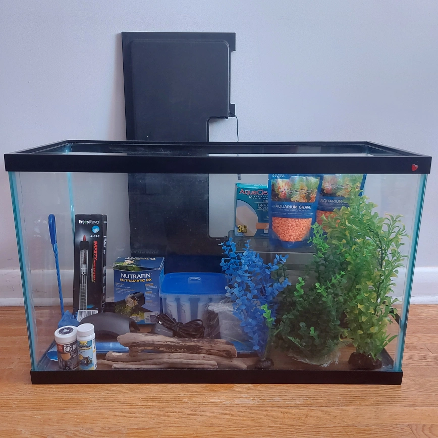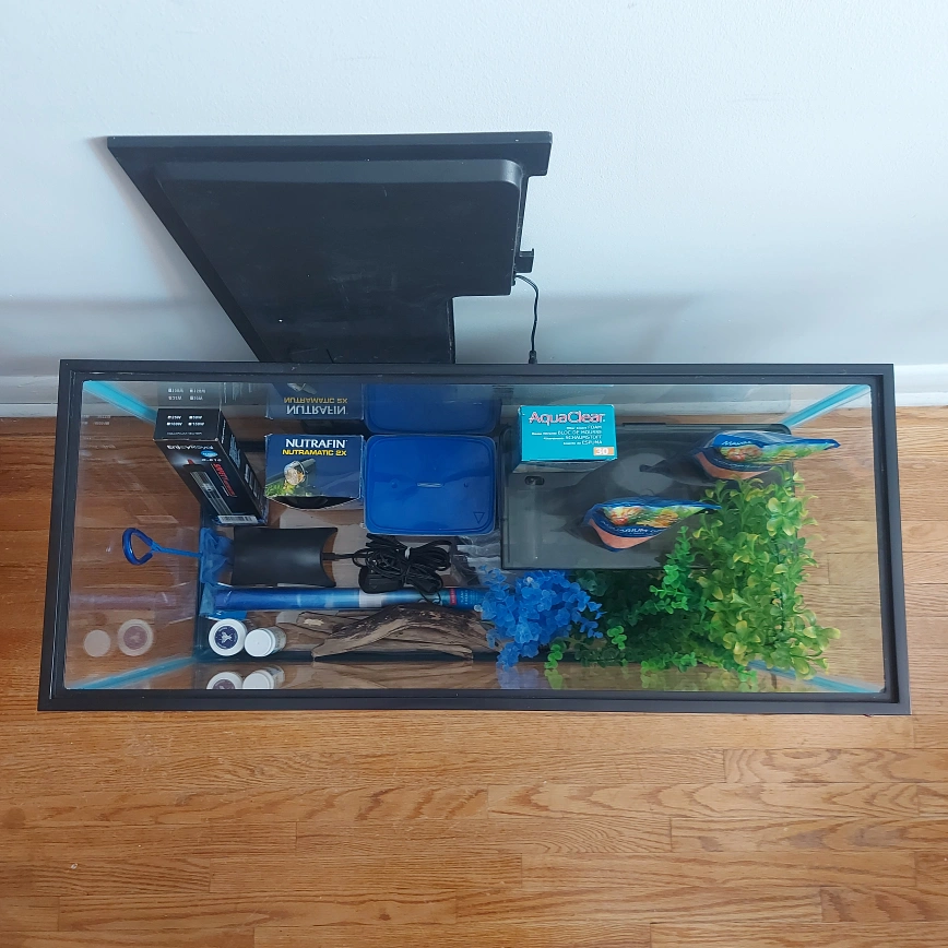 * Discover More Great Deals in My Other Listings! SALE! As NEW: 30 Gallon Fish Tank with LED Lid and Accessories - The Tank is in excellent Condition Dimensions: L: 30 in | H: 18.5 in | W: 12.5 in * Includes: Brand New (Unused): - Heater (original packaging) - 2 Packs of Aquarium Gravel (unopened) - Top Fin Island and Beach Background - Aqua Clear Foam - 3 Packaged Carbon Filters Like New: - Nutrafin Nutramatic 2x Automatic Feeder - Tetra Whisper 10-30 Air Pump - API Freshwater Master Test Kit (barely used) Additional Items: - AquaClear 110 Filter (missing extension tube, available on Amazon) - 3 Large Plant Decorations - Real Driftwood - Fishnet - Fluval Tropical Flakes (barely used) - Tetra EasyStrips Ammonia Test Strips - Temperature Strip (attached to tank) Note: A few LED lights on the lid aren't working but can be easily replaced (see picture number 5). If you intend to buy the original lid from Aqueon, please check the last picture for the model number. --- Special Offer: Bundle with other plant or fish-related items from my listings for discounts Pickup Only: Item available if listing is visible. Delivery is not available.