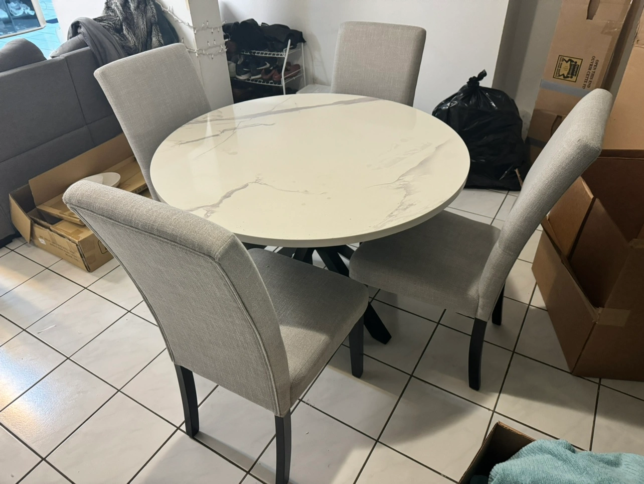 White marble top round dining table with four grey fabric chairs. Verona 5pc Dining Set with Table & 4 Chairs, Culture Marbled Top, Metal, 42"W Round - White I bought from brick for 800$ plus tax selling asap as i need 8 chairs now
