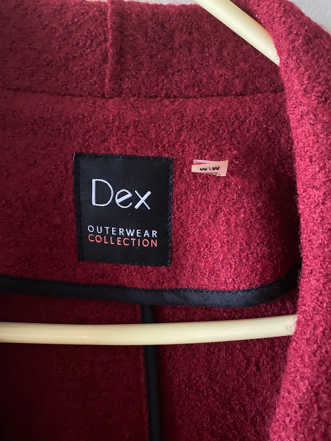 A long, burgundy coloured coat from the Dex Outerwear Collection. It has a collarless design with two pockets and a tie closure. It's a great piece for any wardrobe.