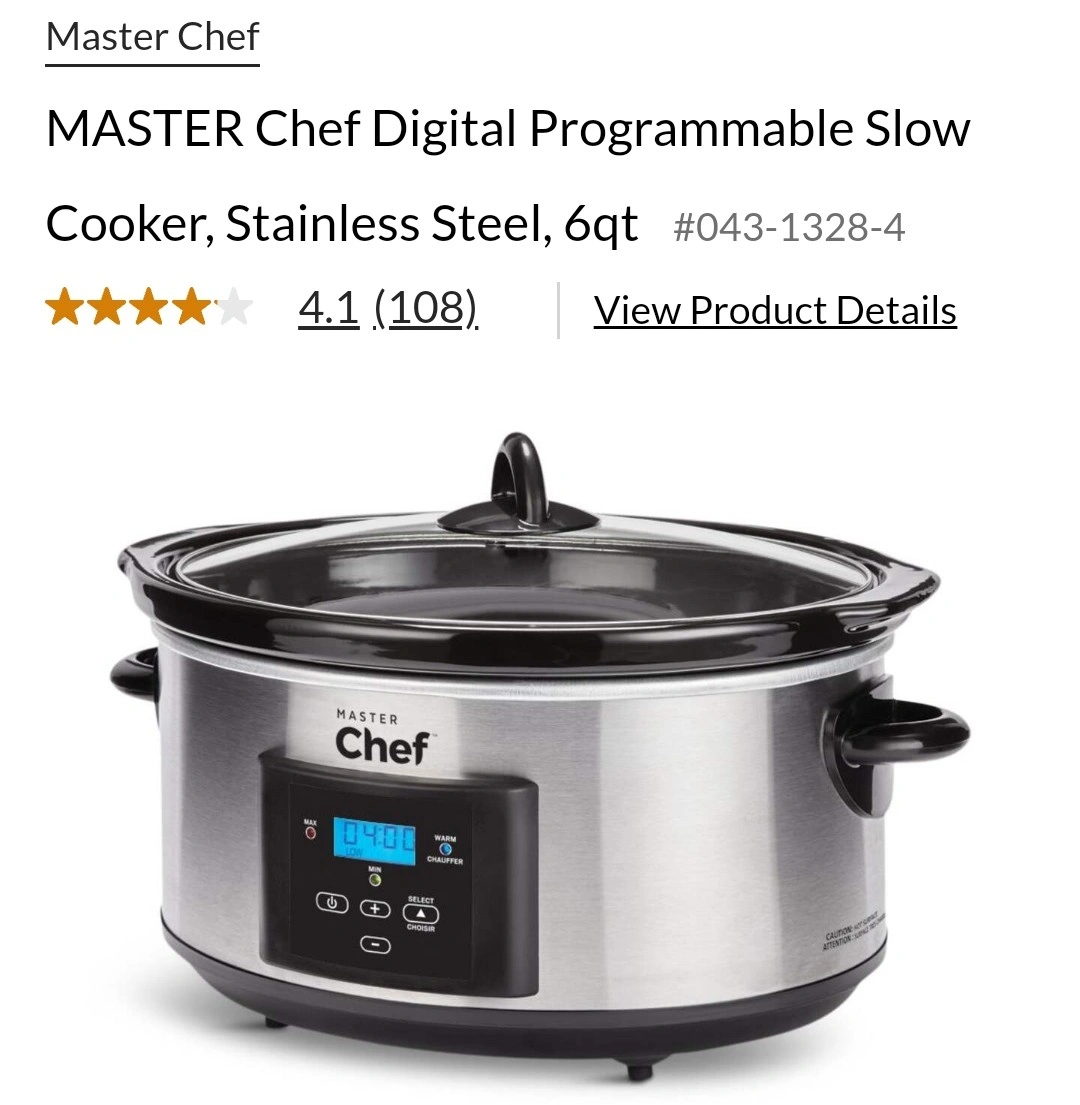 Stainless steel slow cooker with a digital display. The cooker has a glass lid and two handles. It can be used for cooking low and slow.