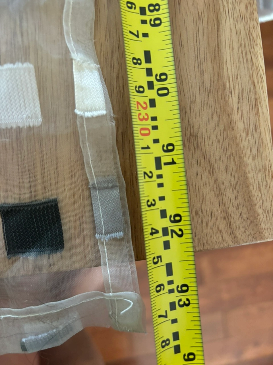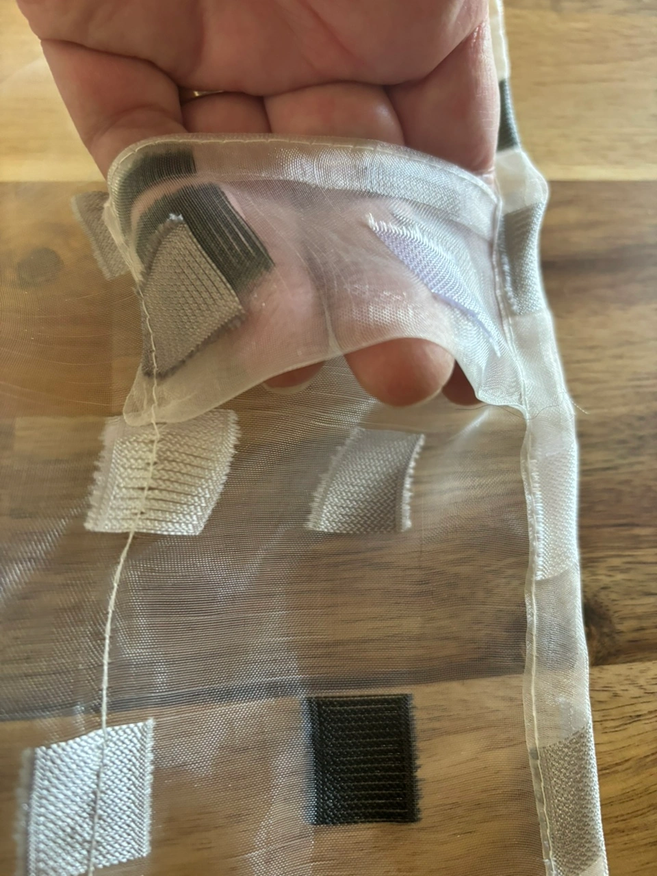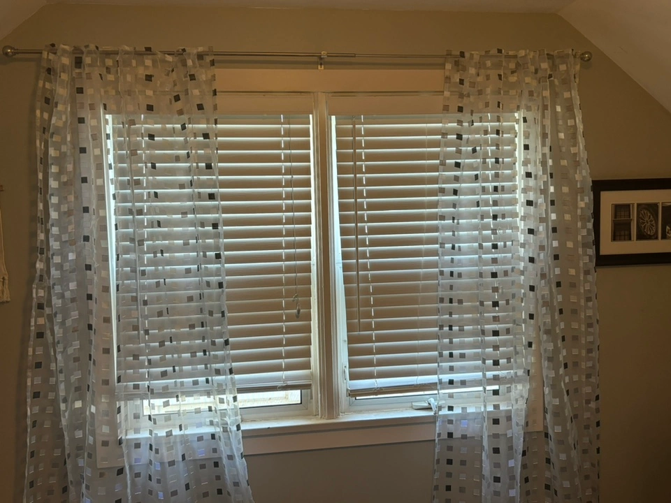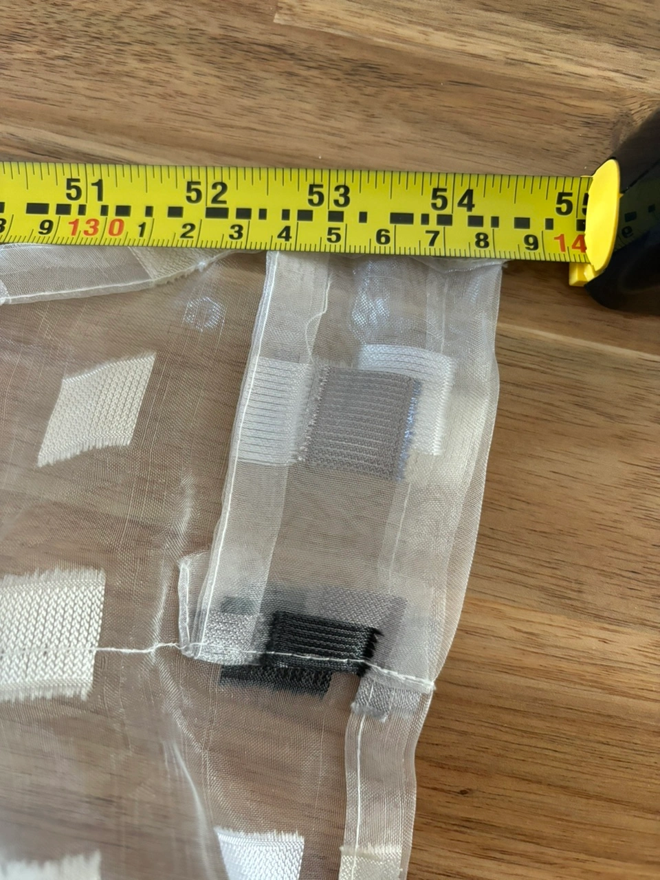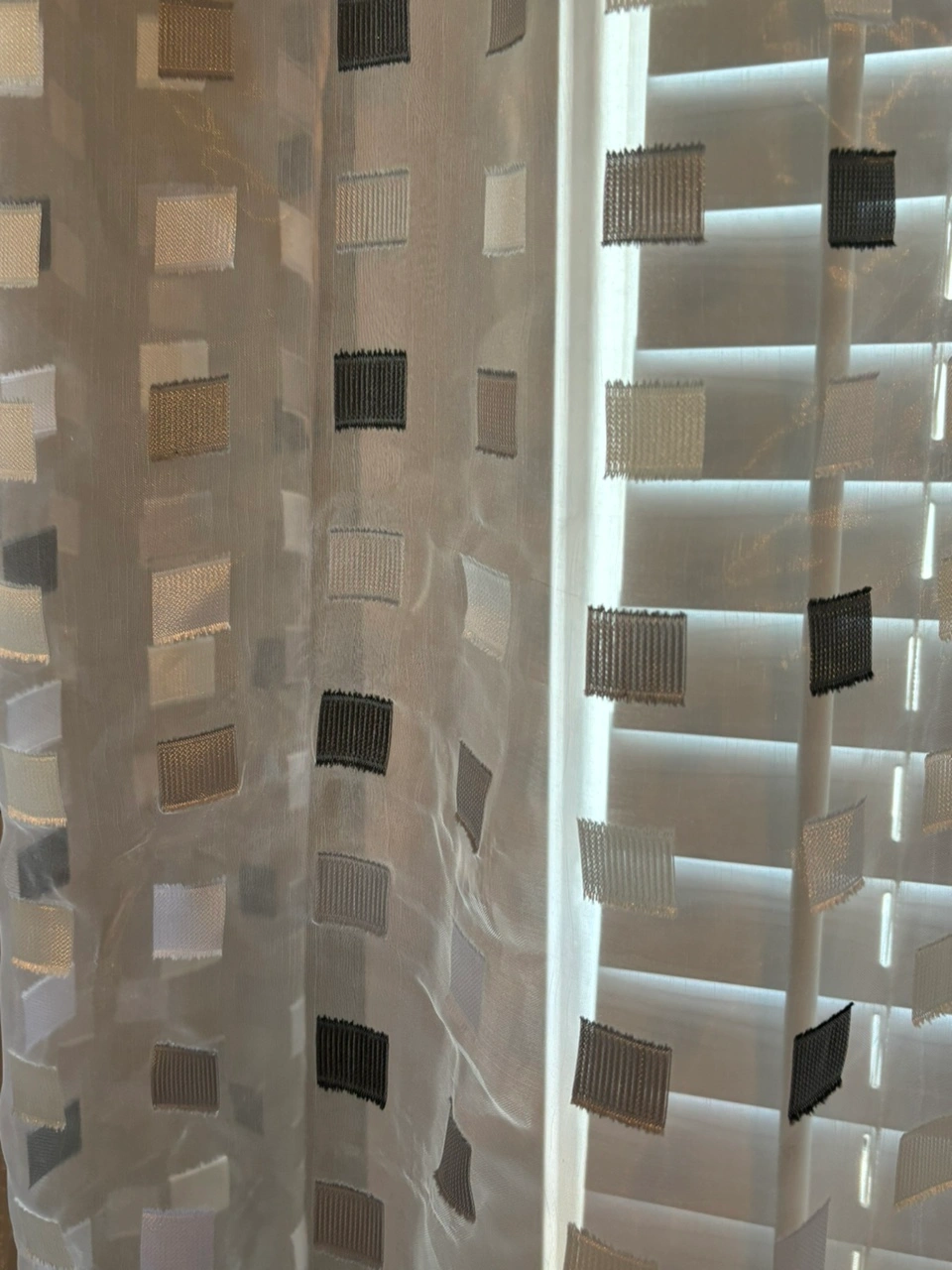 2 sheer curtains with a geometric pattern in white, grey, black and beige. The curtains are approximately 54 inches wide by 93 inches long. They have a hidden tabs to slide curtain rod through for “no show” hanging.