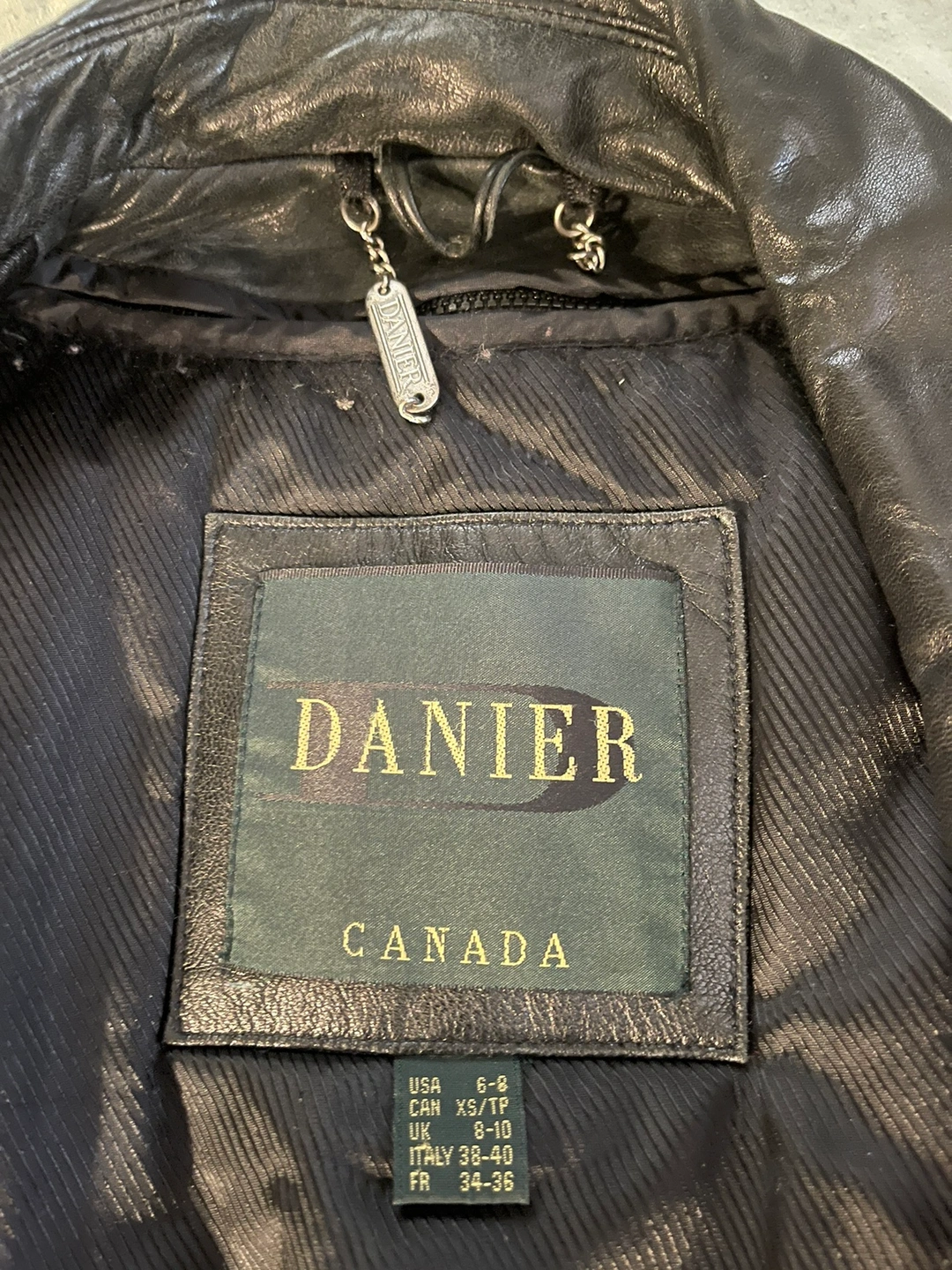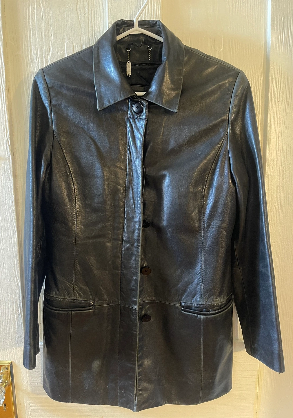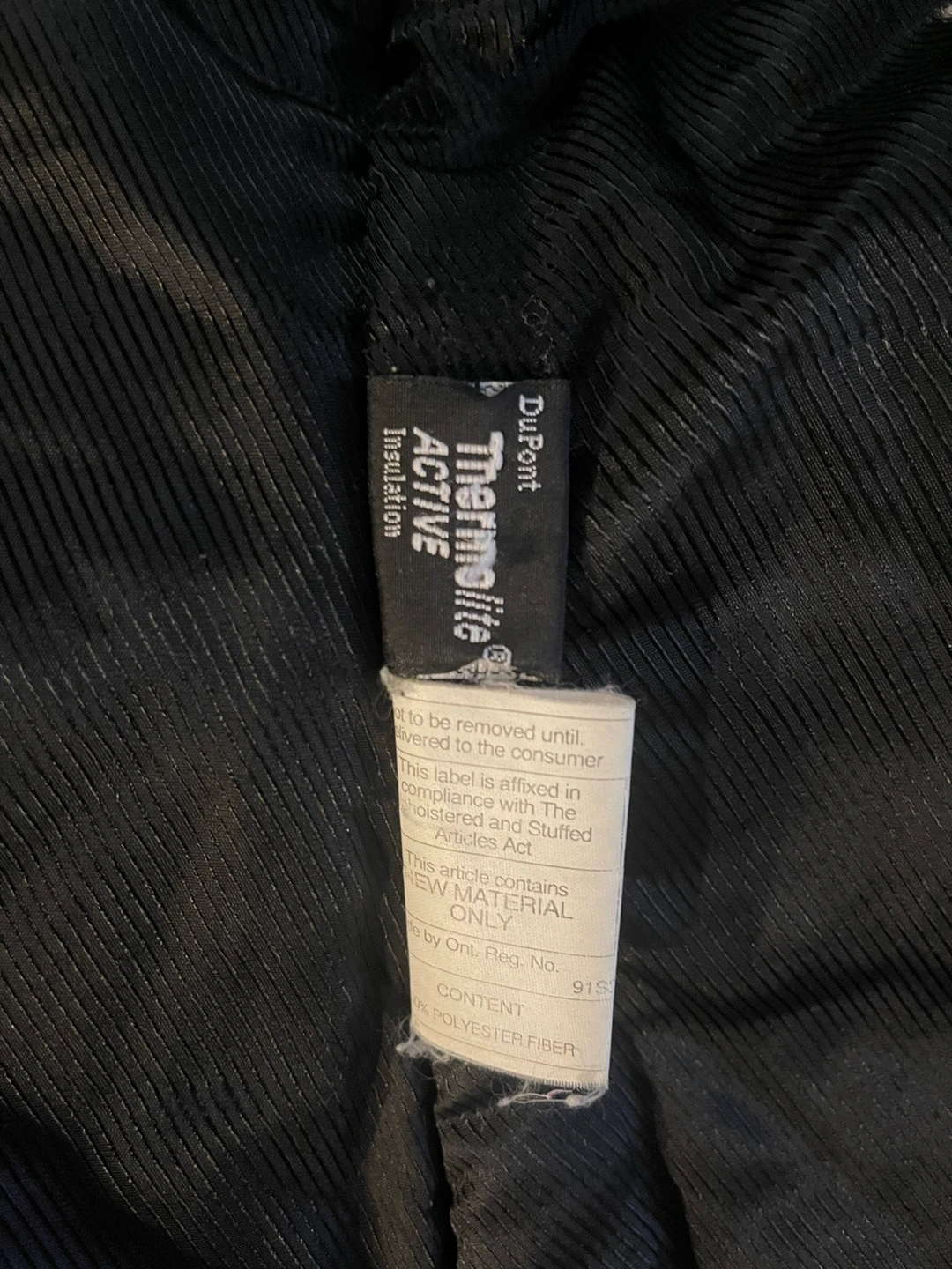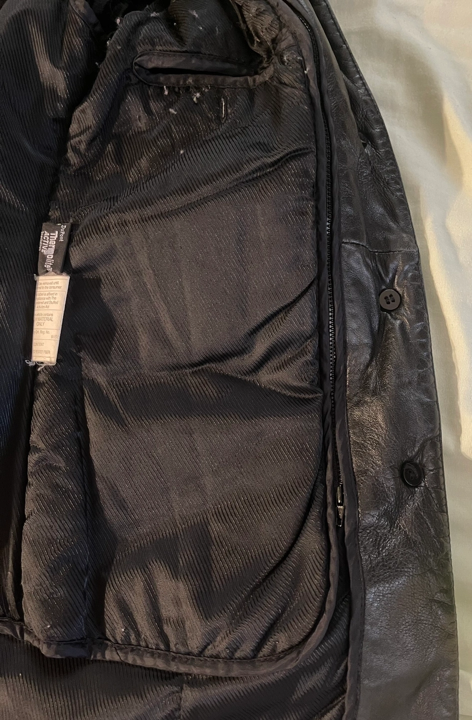 Black leather jacket with a button closure. Size 2-4. The jacket has a three pockets, one on the inside. The thinsulate vest is removable.