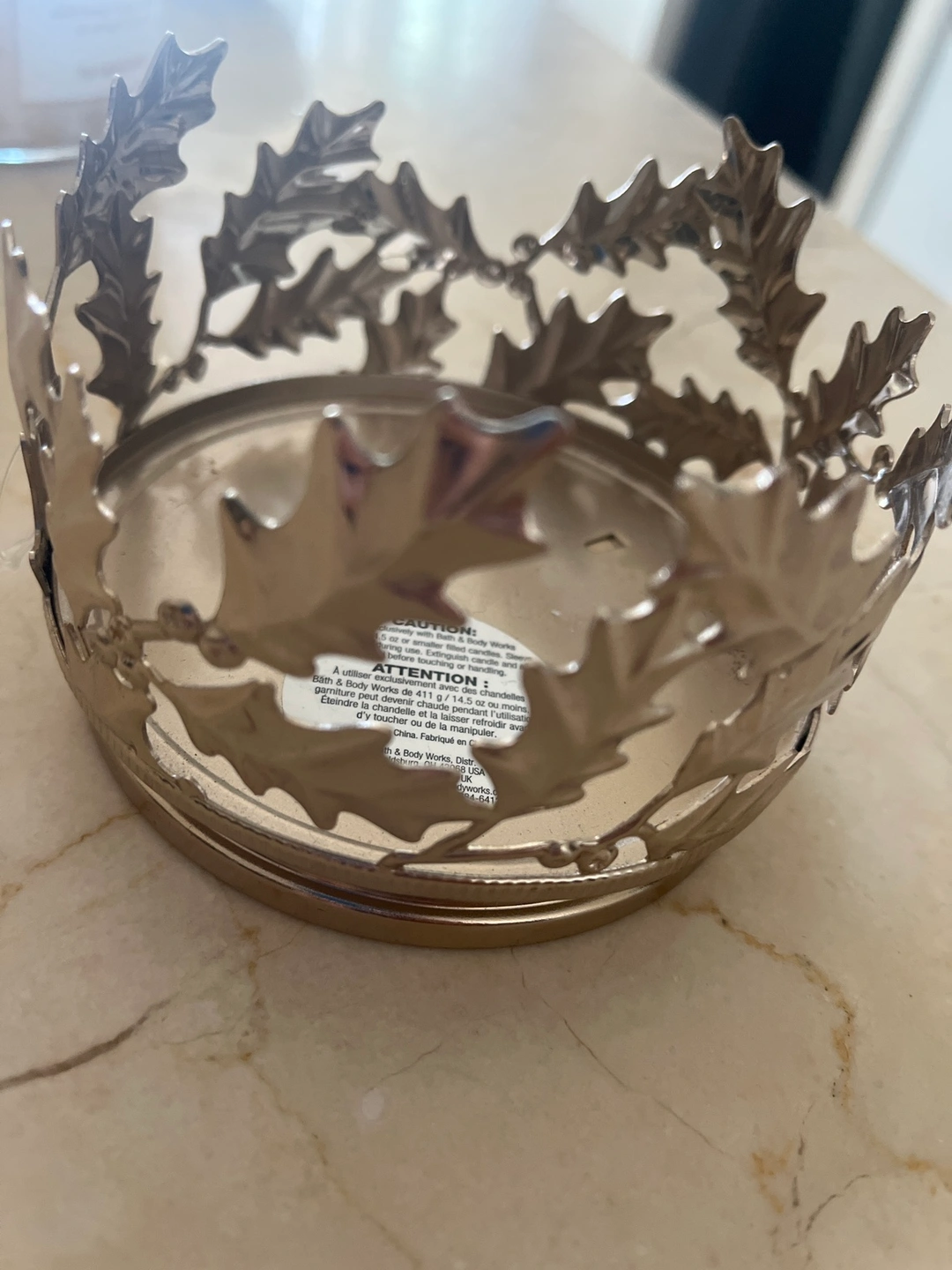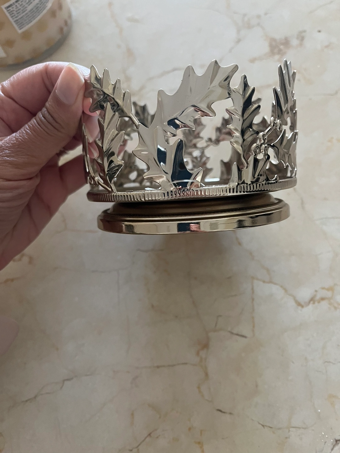 A silver candle holder with a leaf design. It is approximately 4 inches in diameter and 2 inches tall. New has not been used Pick up at king station