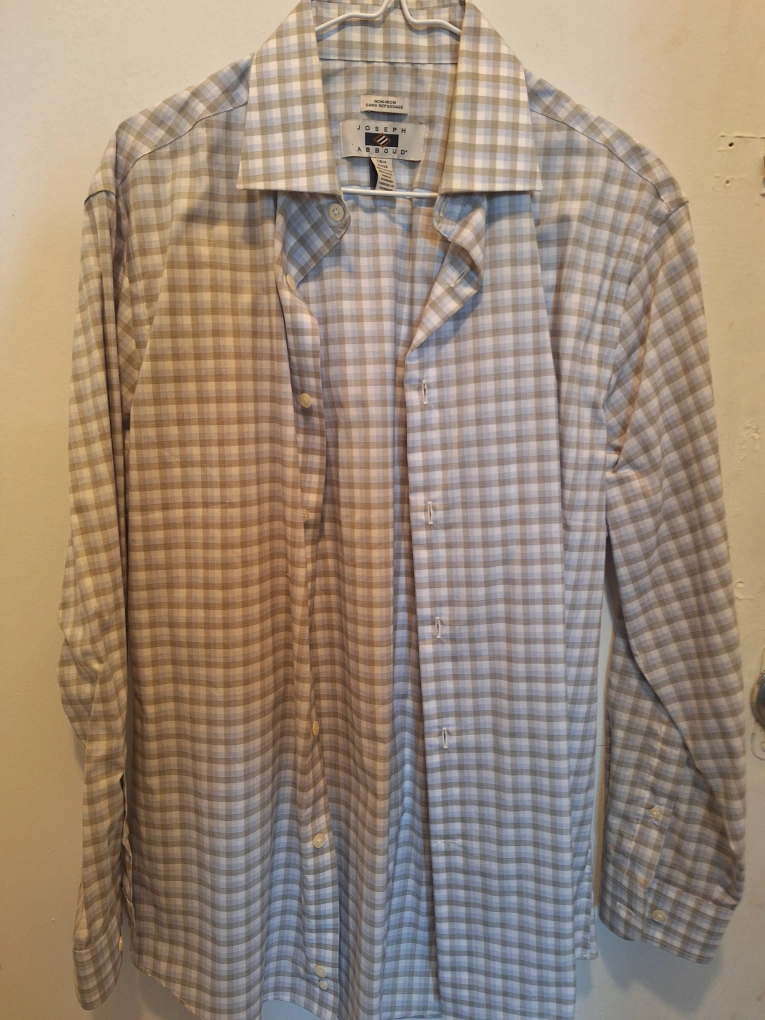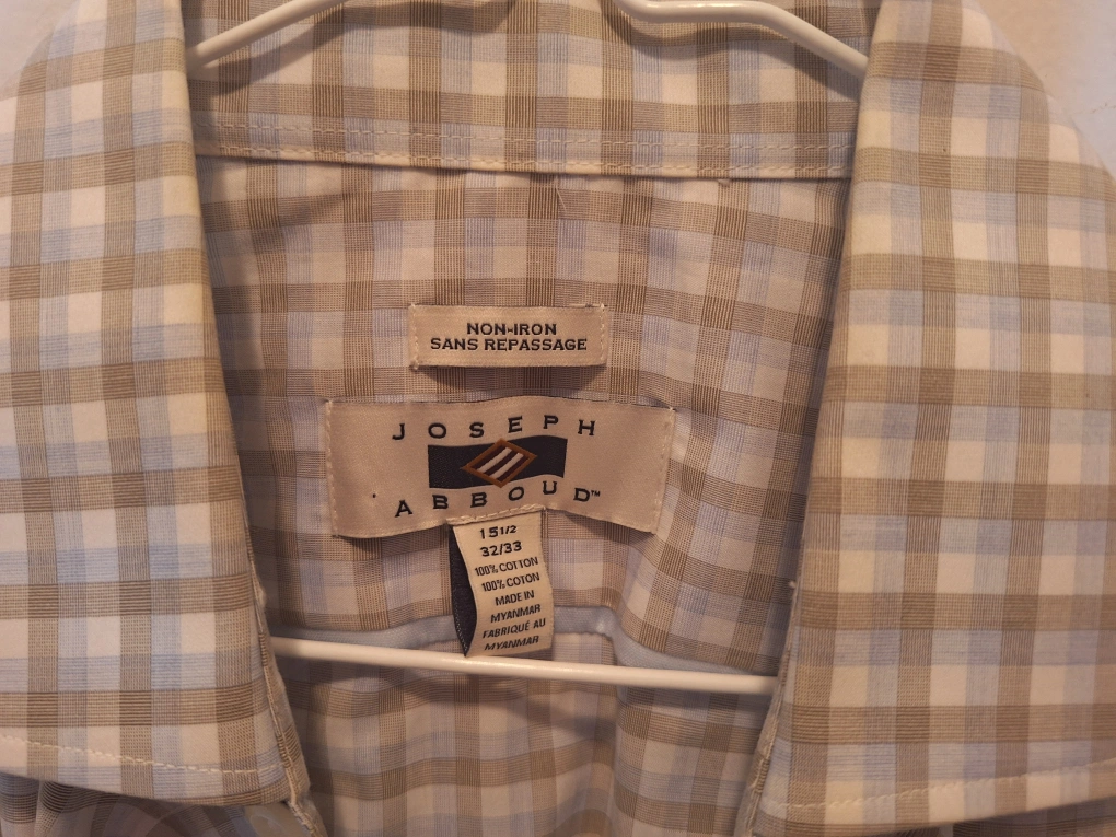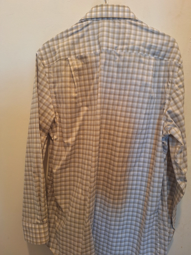 A men's long sleeve button up shirt with a checked pattern. It features a collared neckline and a button closure. New Without Tags