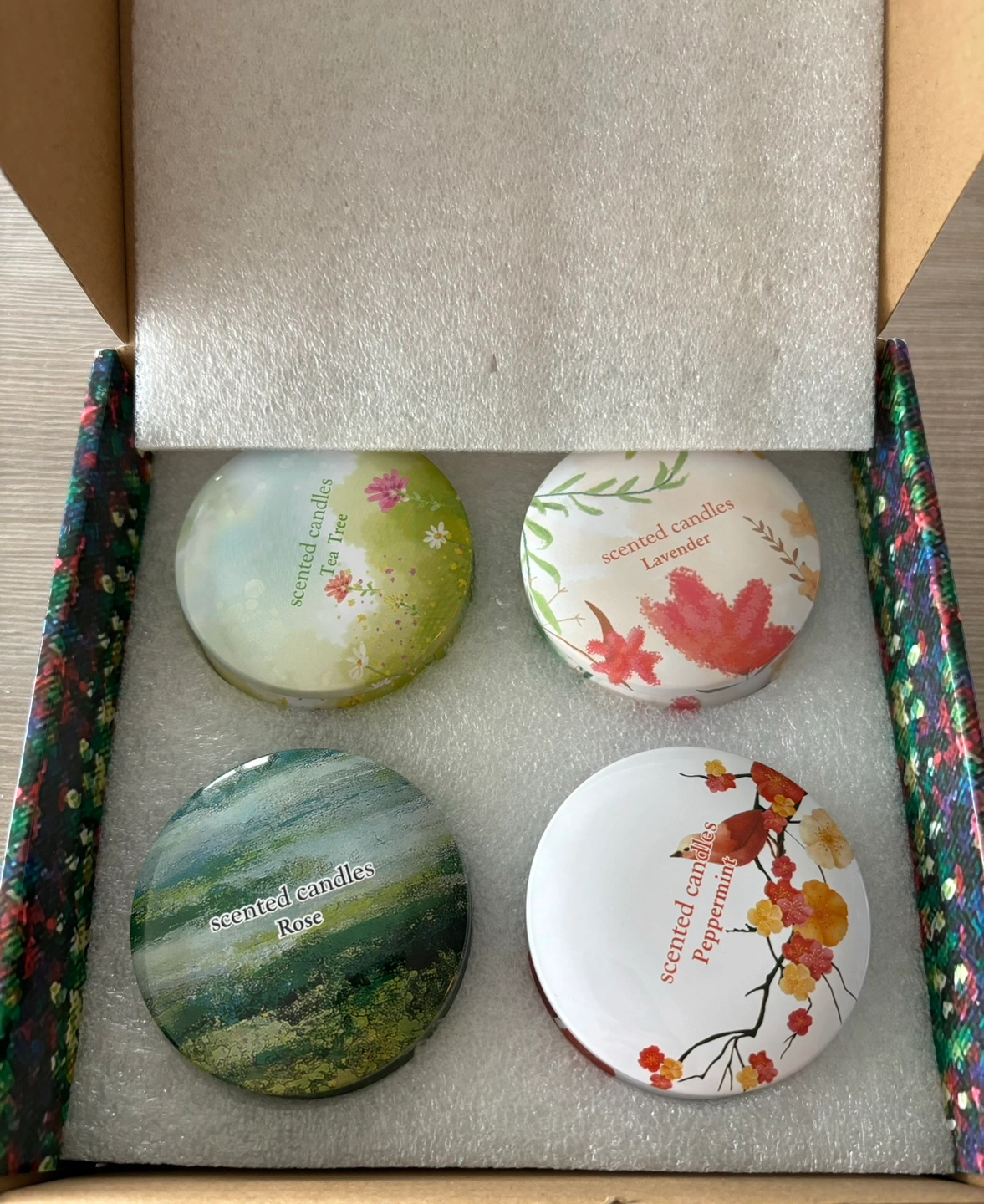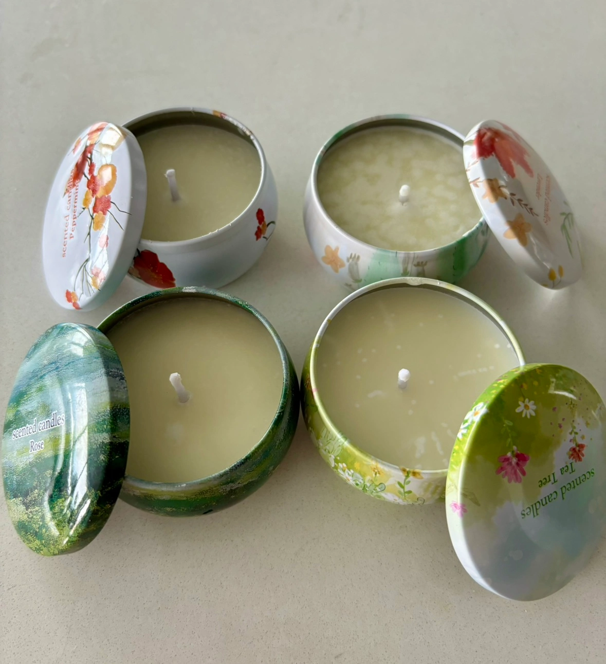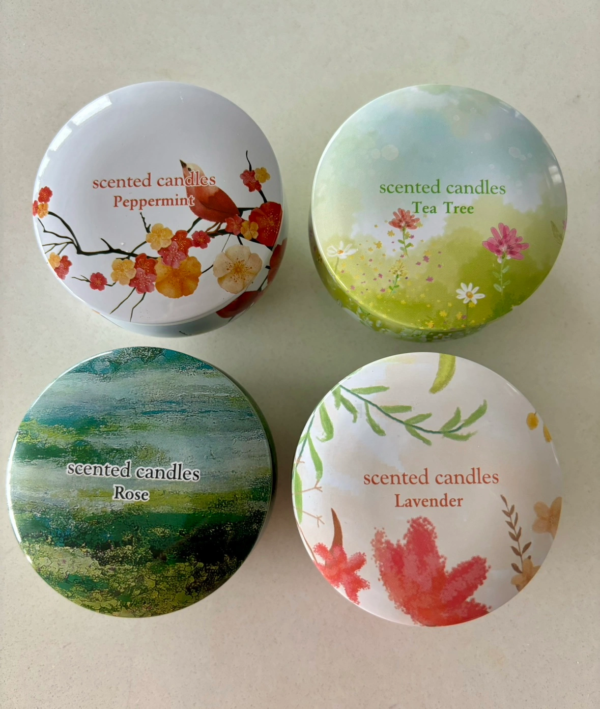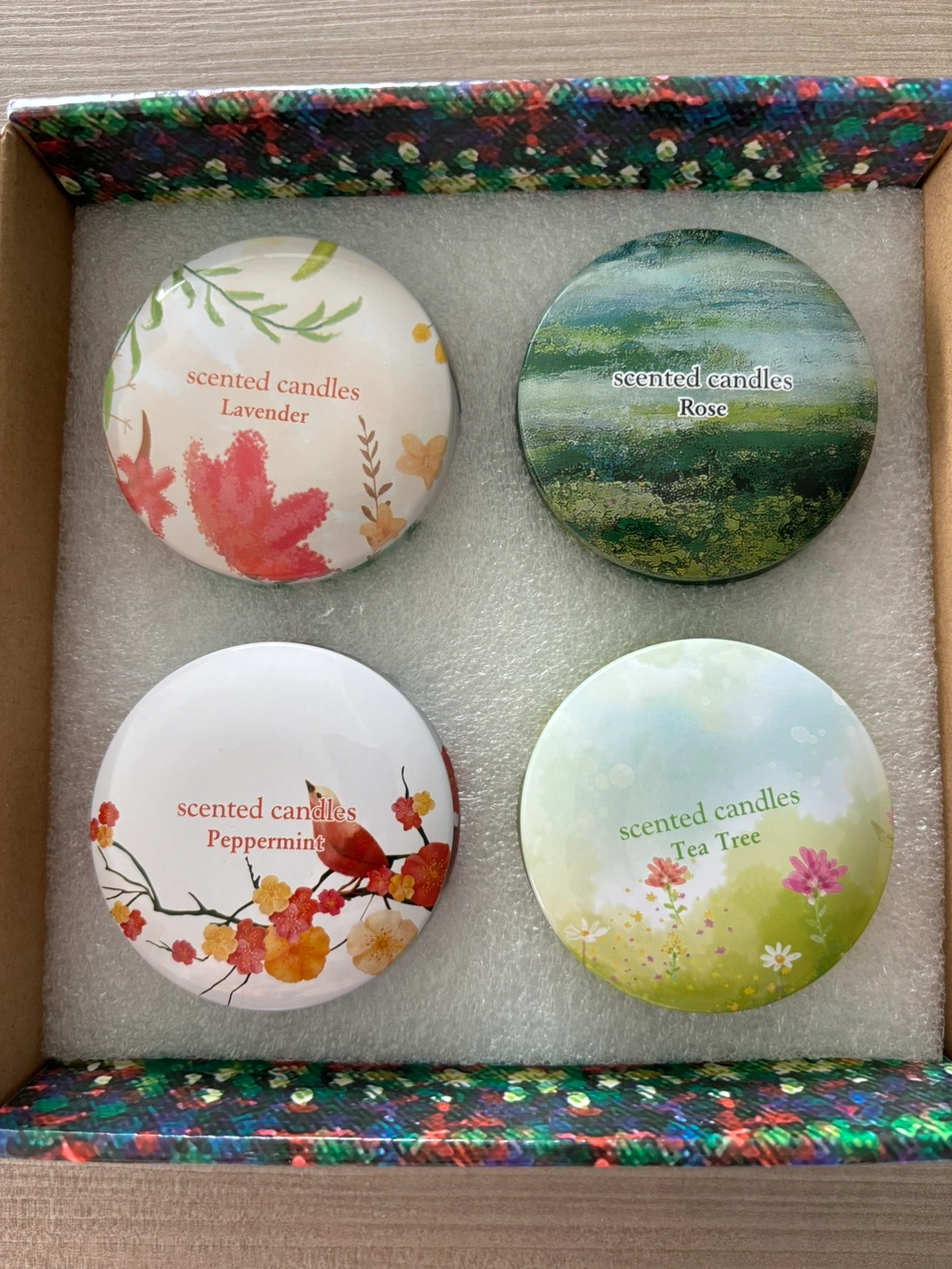 Set of 4 scented soy wax candles in decorative tins. Scents include Peppermint, Tea Tree, Rose and Lavender. The candles are in the original box. Made from natural soy wax and essential oils, along with the 100% lead-free organic cotton wick, they provide a cleaner longer burn. Once fully burned, these beautiful tins can be reused as a decorative storage container. I bought the set a few years ago on Amazon. Now making own candles I need to purge some. Selling well below my purchase price of $20+. Click on my name for my other listings and pickup locations.