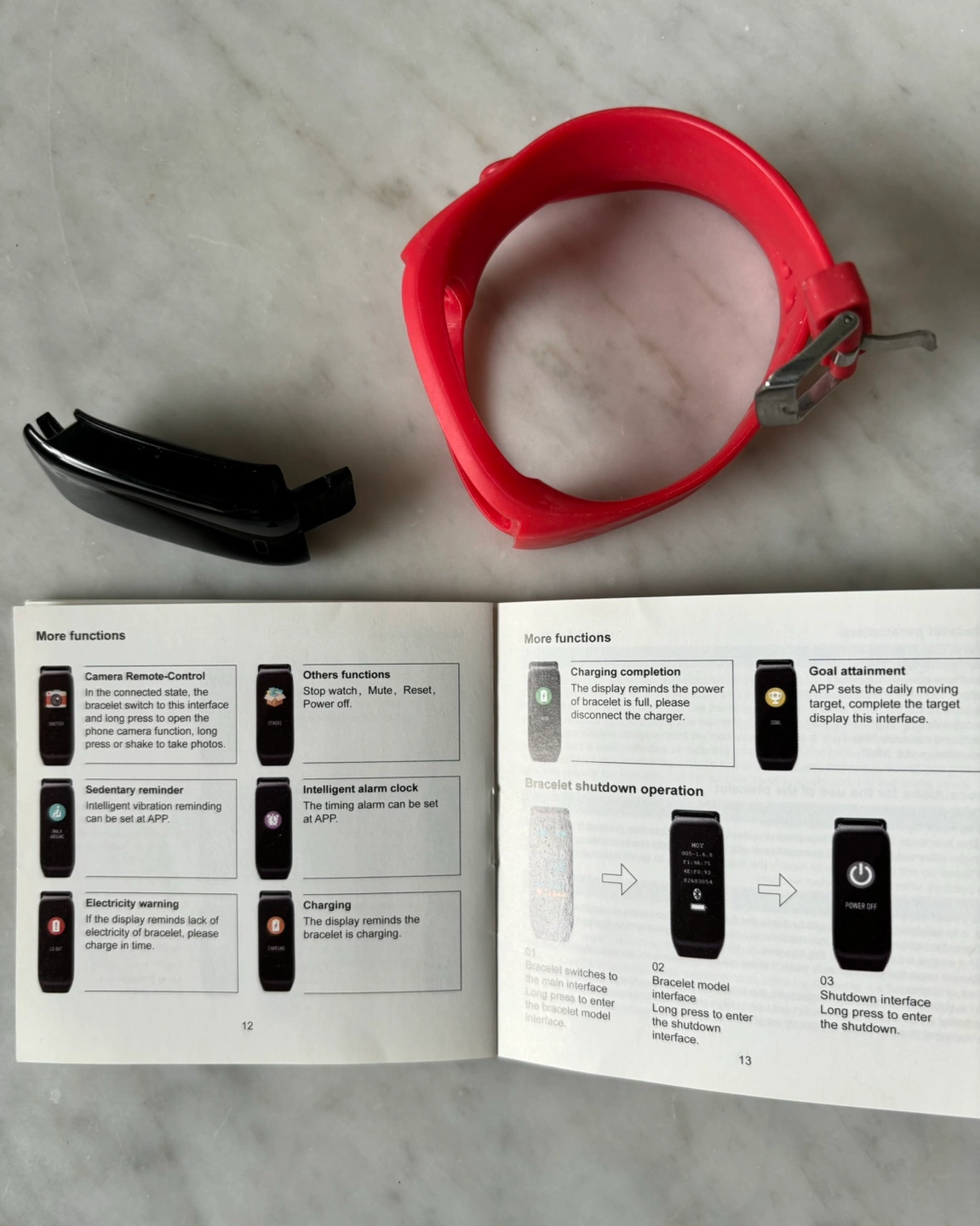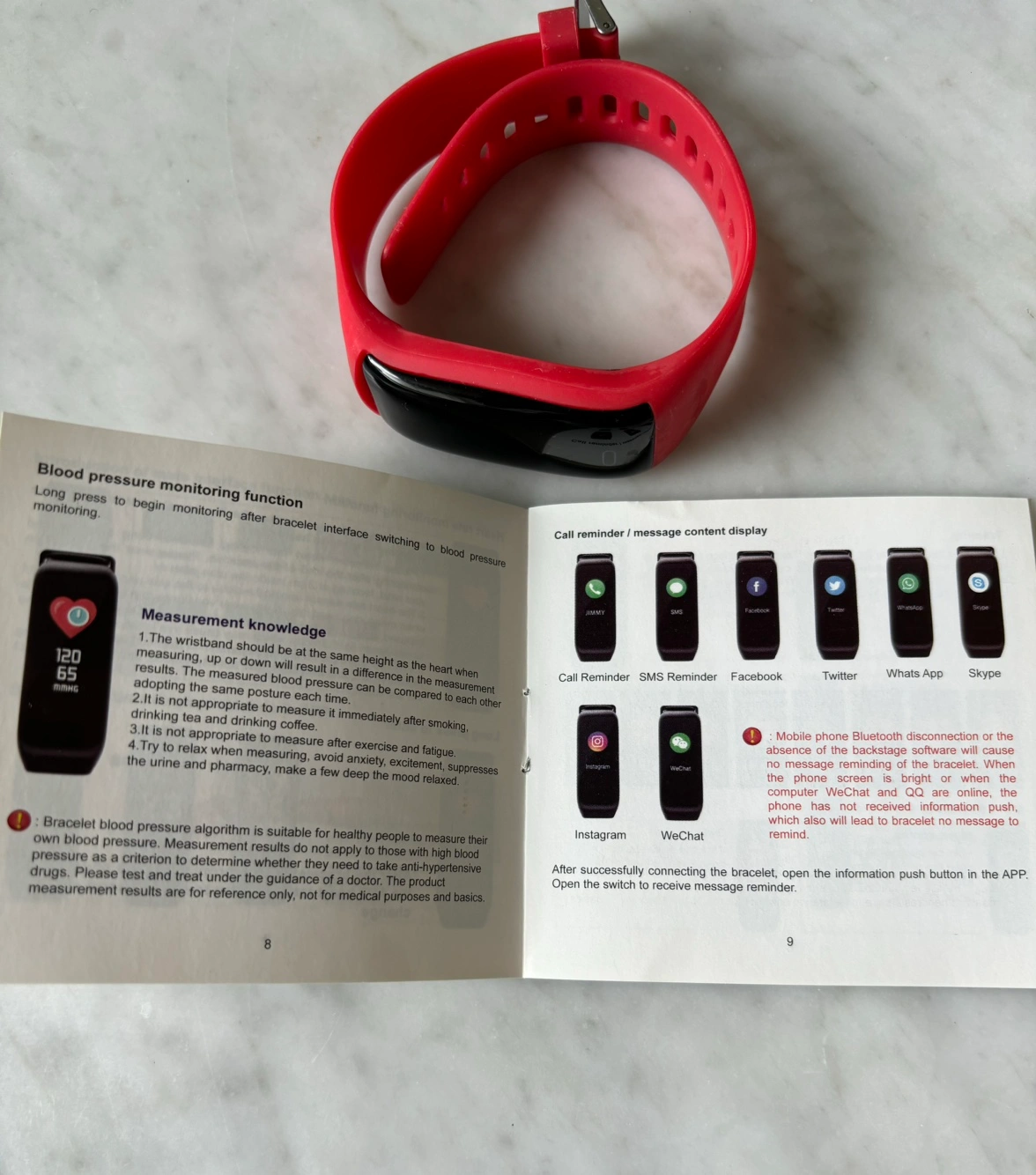 This smart bracelet is red and comes with a user manual. USB charged. Bought for mom several years ago (last pic shows pretax price). I tested by briefly using it, then mom just put it away. Click on my name for my other listings and pickup locations.