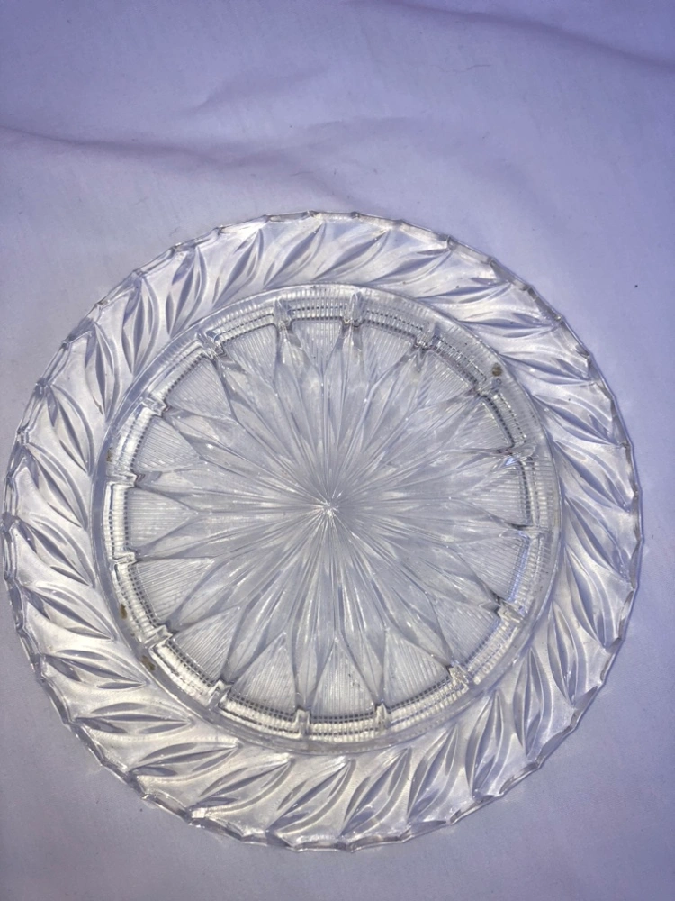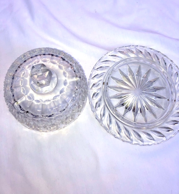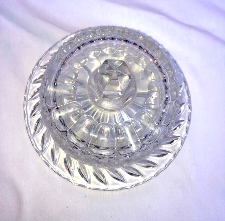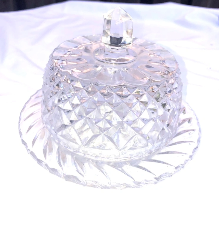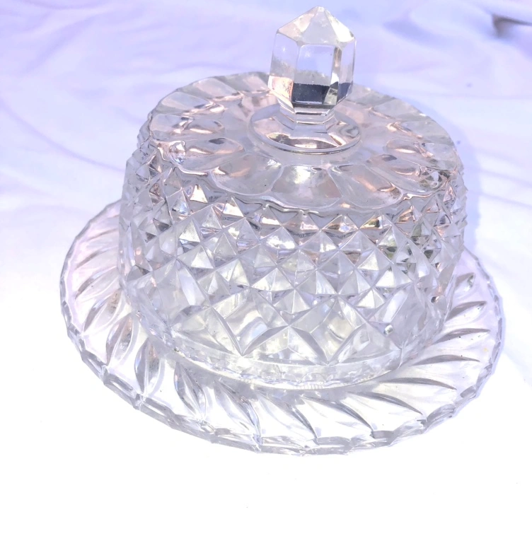Crystal cut glass butter dish with a lid. There is a decorative pattern on the dish and lid. The lid features a crystal knob.