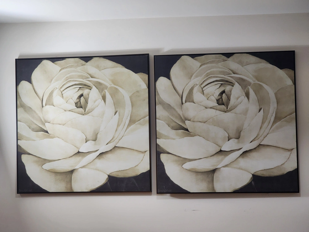 Two framed prints of a white flower on a black background. They are both in matching black frames. $30 or both for $50