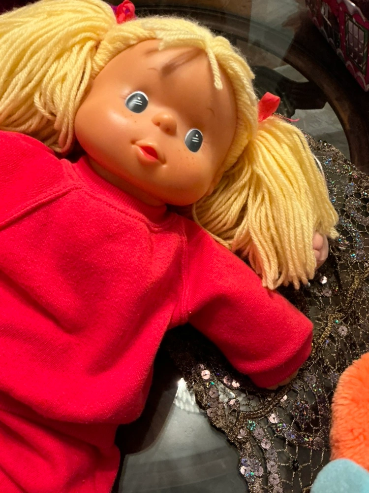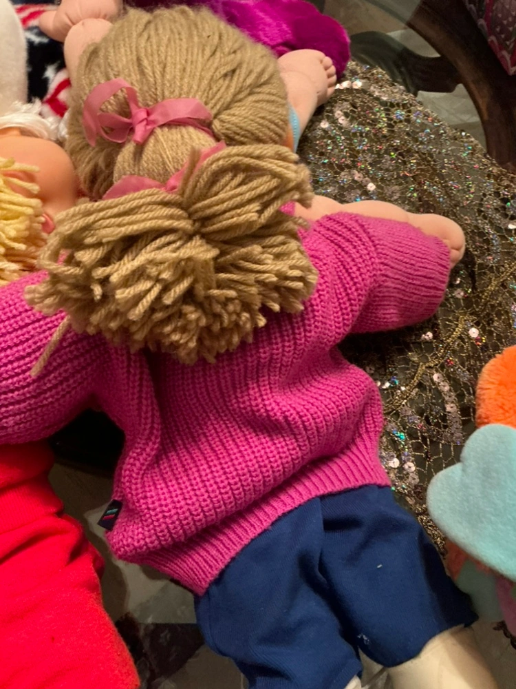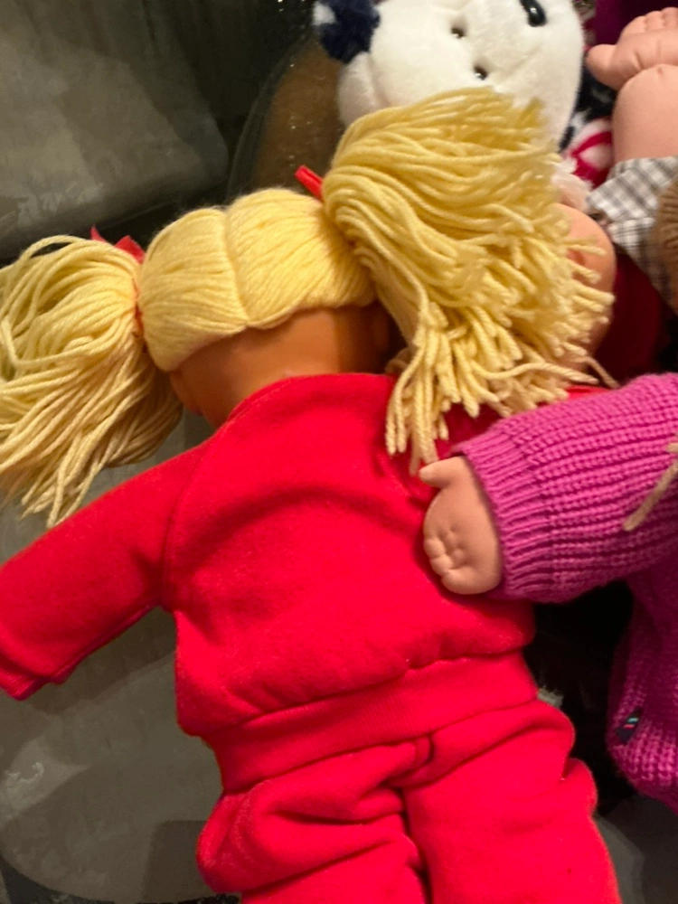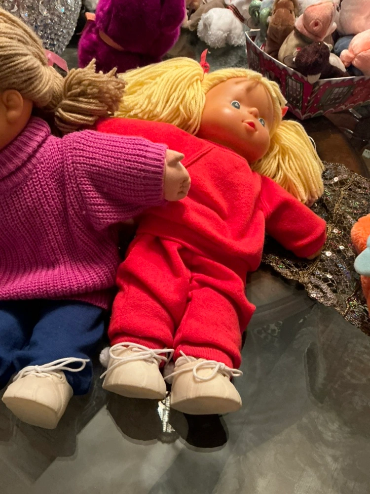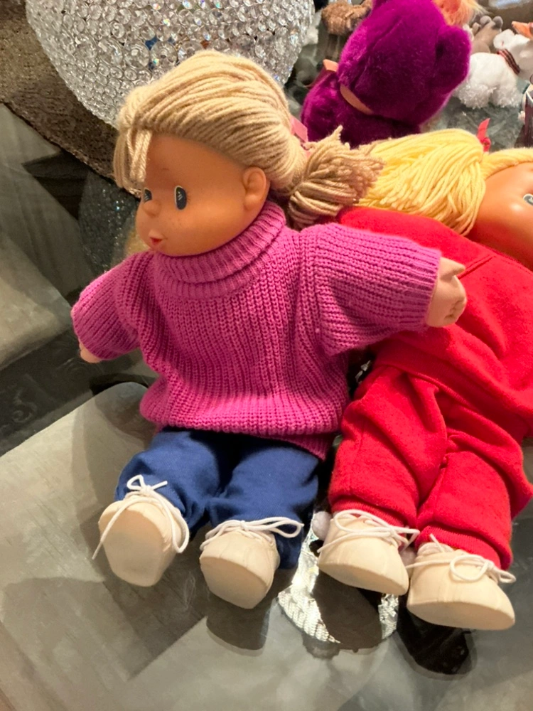 2 Daniel hechter dolls. One in a red track suit and other in a pink sweater, and blue pants. She has blonde and brown yarn hair. From fairweather store in the 70s. $20 each. Dolls were never played with.