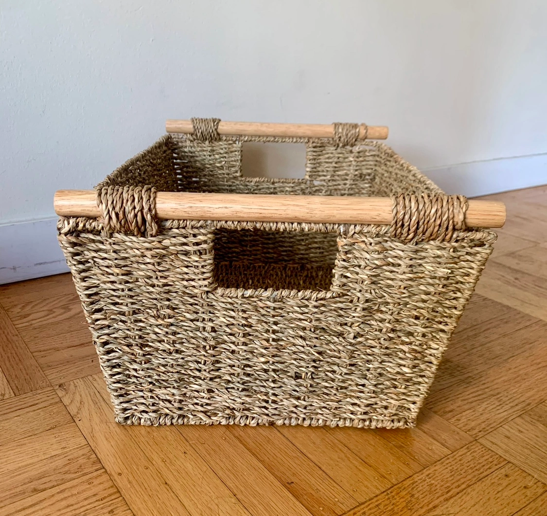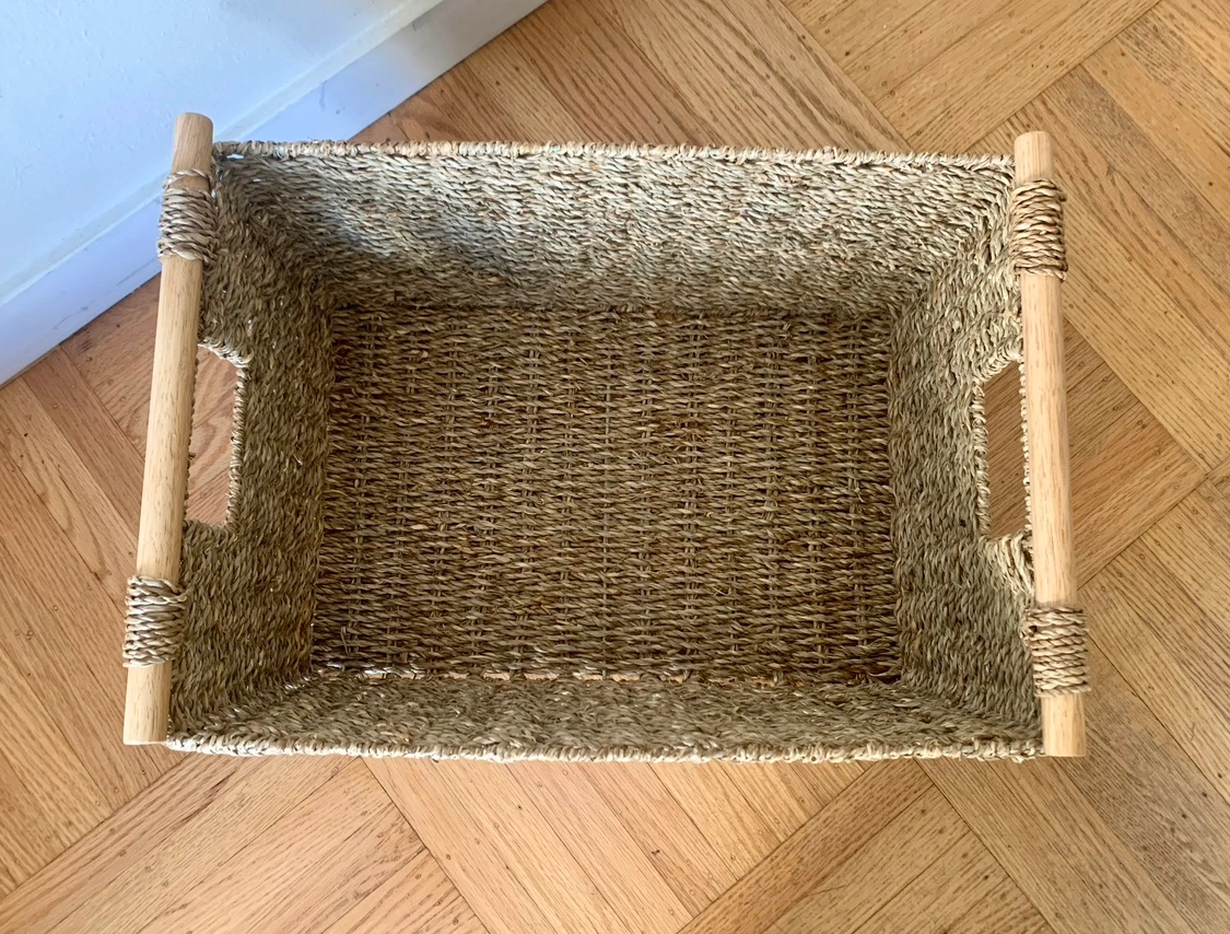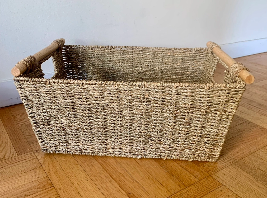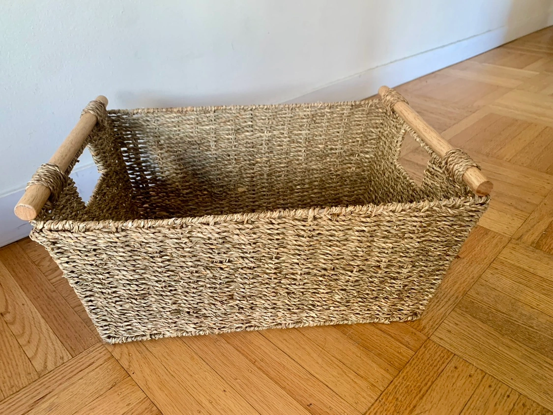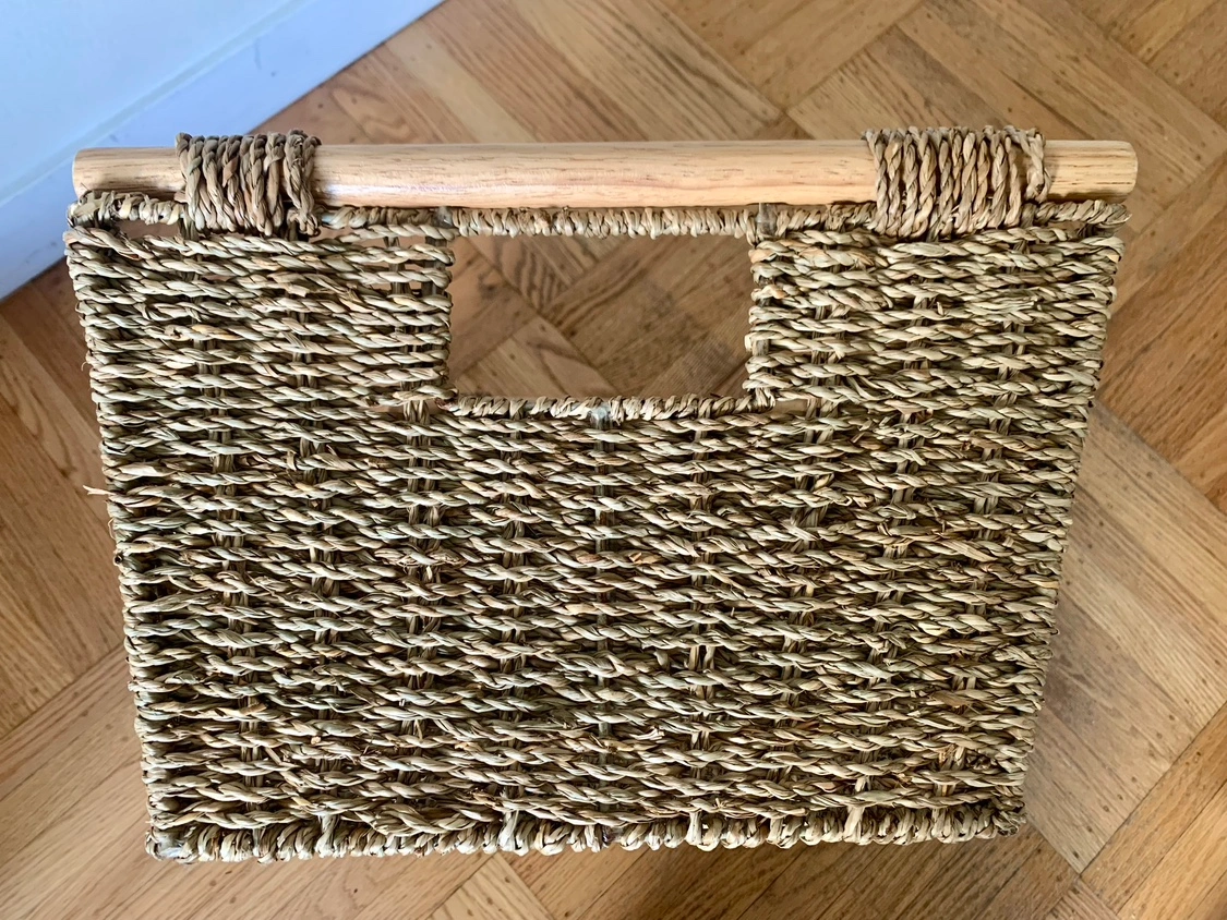 A beautiful woven wicker basket with wooden handles. Great for storage or decor. The basket measures approximately 30 cm in length, 20 cm in width, and 15 cm in height. Approximate inches in the dimensions section. $20 Cash or etransfer Pick up in the West End on Barclay Street (Thurlow) Check out my other listings.