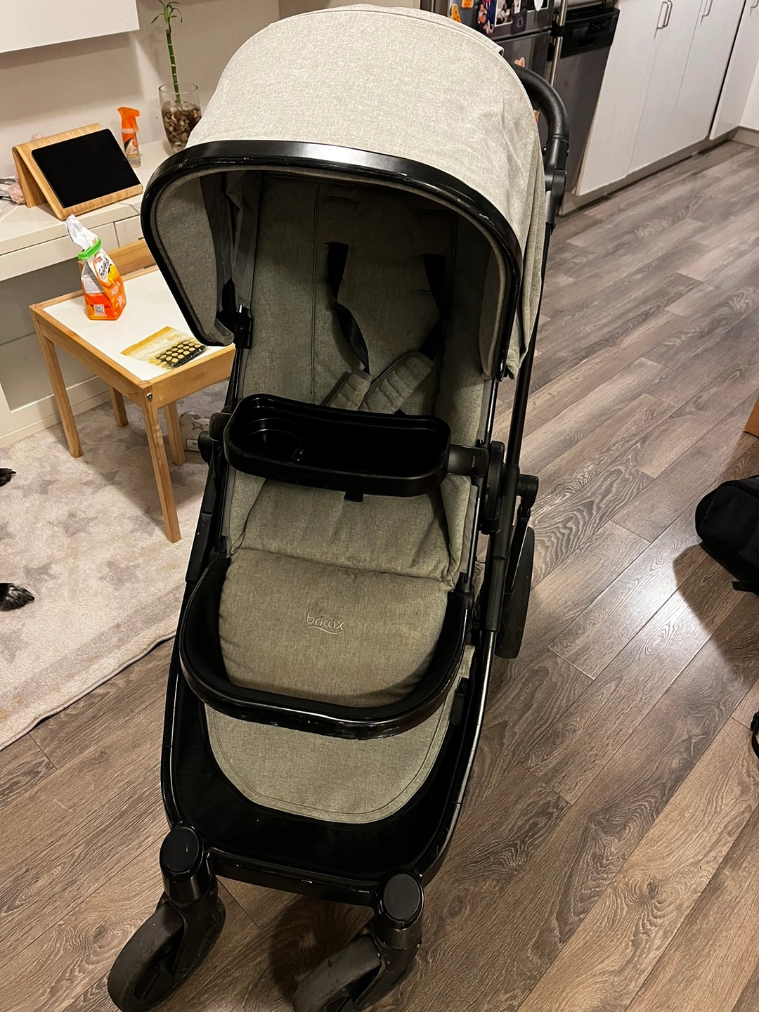 The stroller is in great condition and comes with a cup holder, and rain/wind cover. It's easy to fold and manoeuvre and is very sturdy.