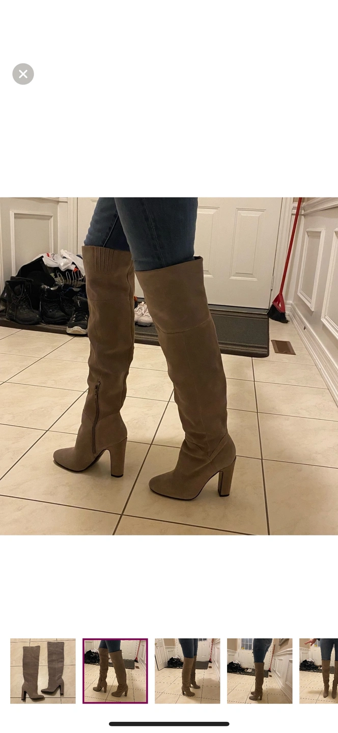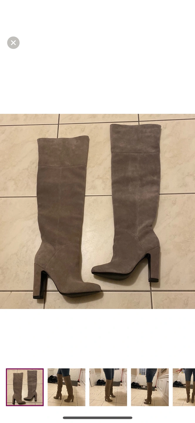 Grey suede over the knee boots with a block heel. The boots have a side zipper and are in excellent condition. Paid over $250
