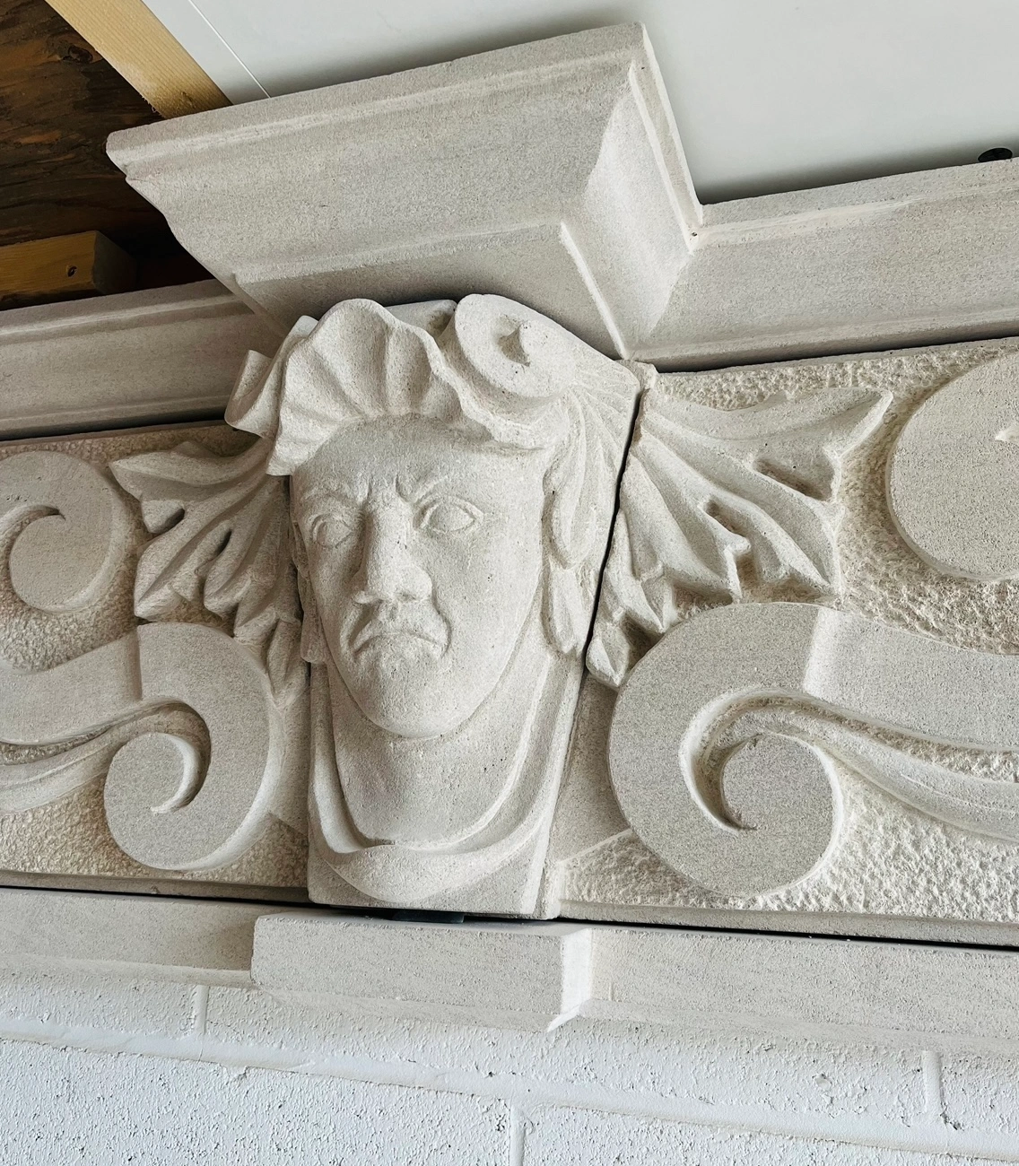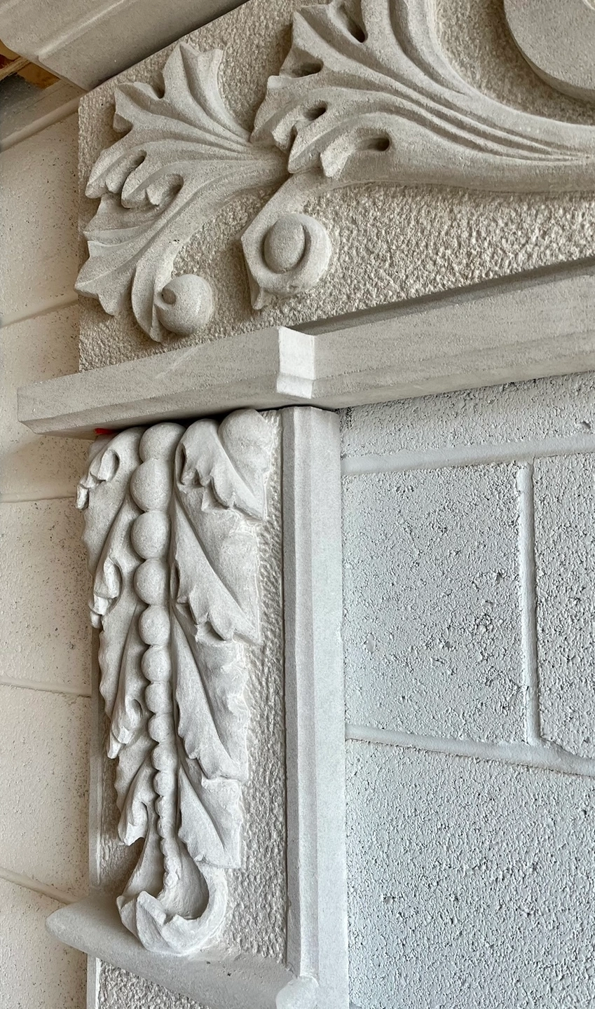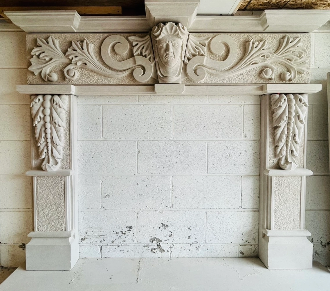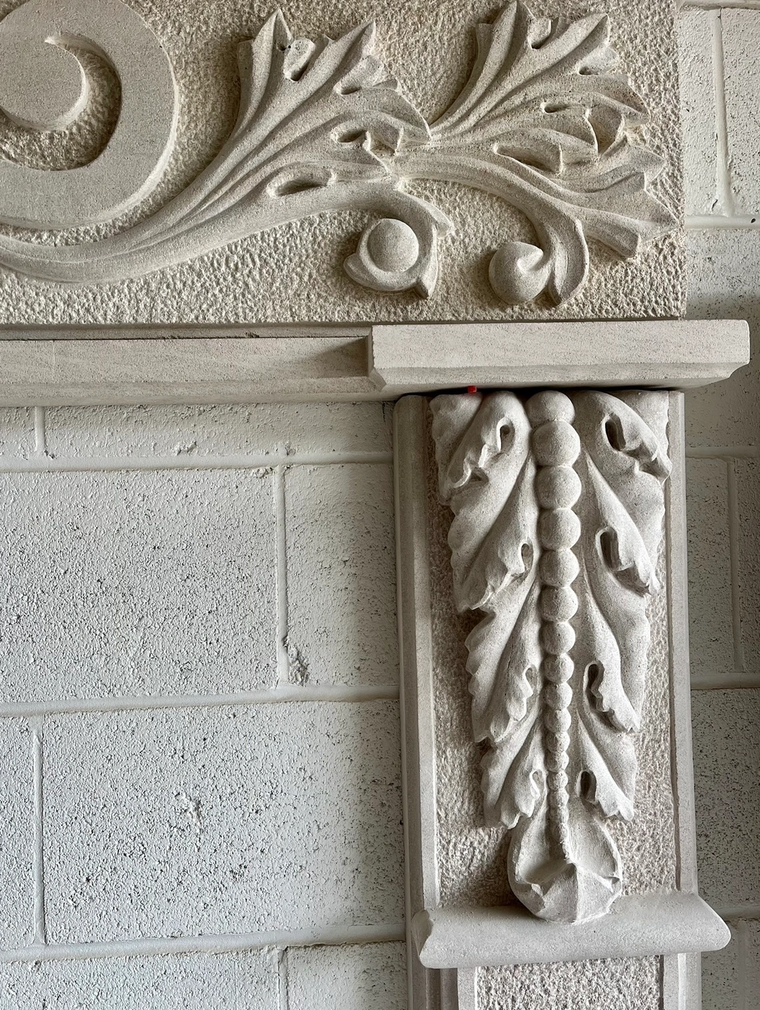 One of a Kind Handcarved Indiana Limestone Fireplace Mantel Width 63” Hight 53” Firebox opening 41 x 37” Size - Adjustable Not cast or moulding, this is real thing- limestone carved by hand Artist Sylvio Suga Transport & Installation Toronto and surrounding areas