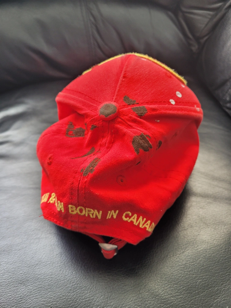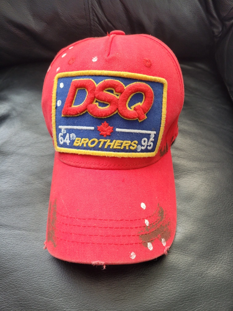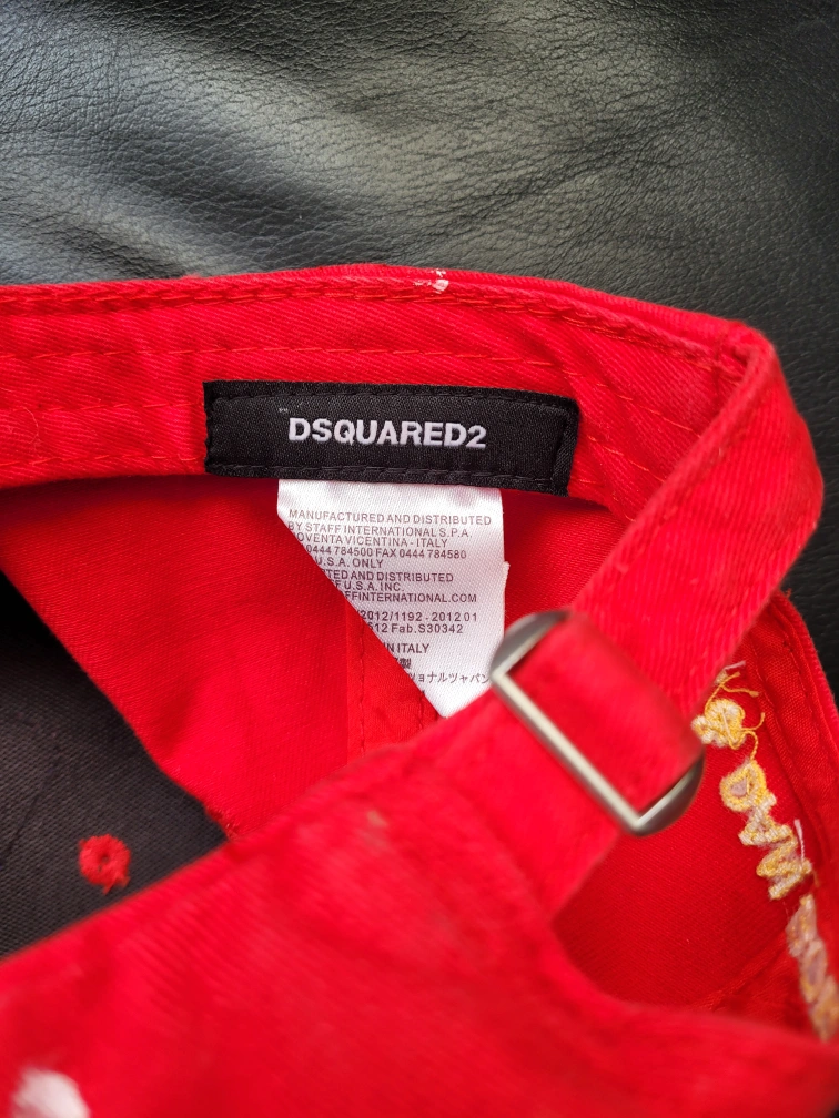 Red baseball cap with a Dsquared2 logo and a "Born in Canada" inscription. It is a size medium. The cap has an adjustable strap.