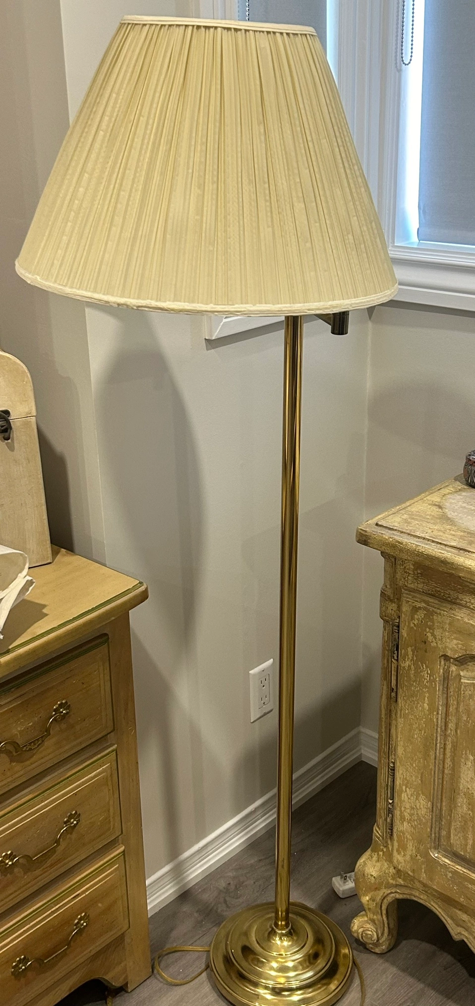 Gold floor lamp with a pleated lampshade. The lampshade is off white. It has a simple design with an adjustable height. The cord and plug are included. The lamp does not include a bulb. The lamp is in good condition, but it is pre-owned and does have a few minor scuffs on the base. Please feel free to contact me if you have any questions.