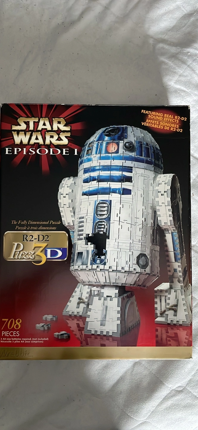 This is a 708 piece 3D puzzle of R2-D2 from Star Wars Episode I. The puzzle is fully dimensional and features real R2-D2 sound effects. It requires 3 AA batteries (not included). Open but never put it together. All pieces there and untouched.