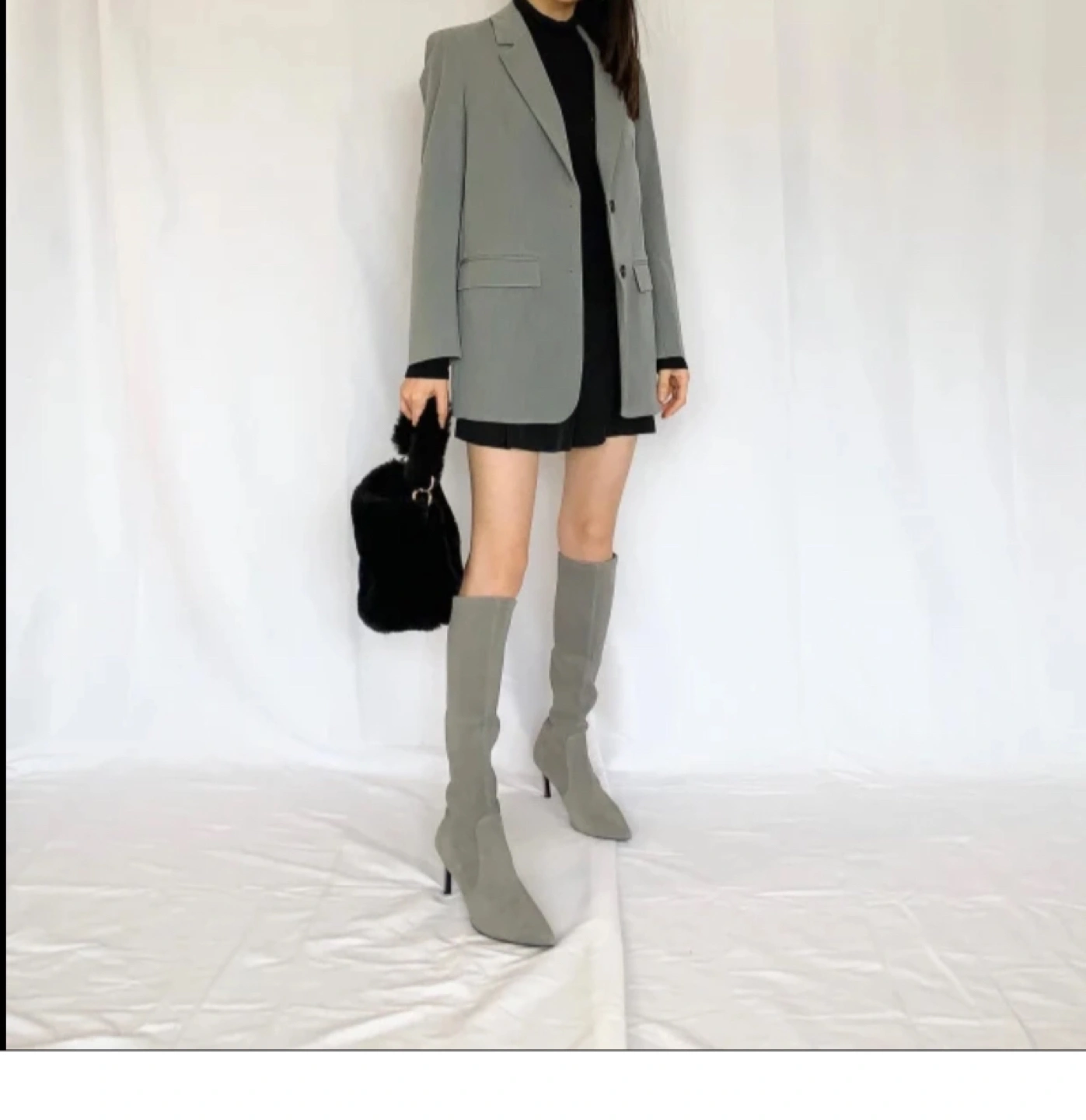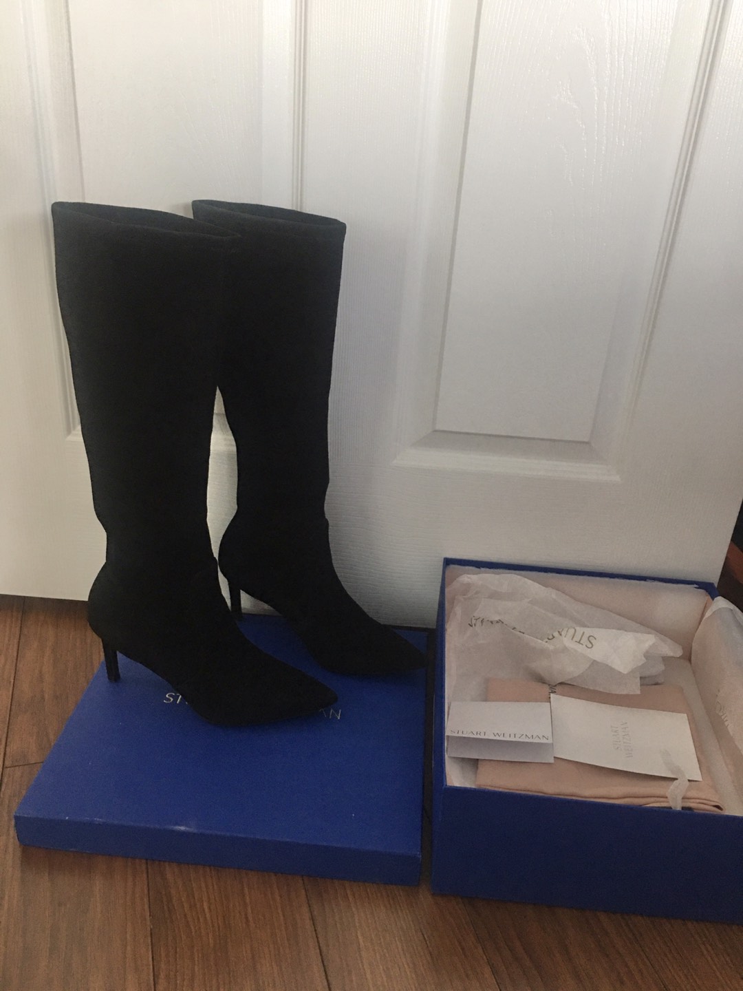 Brand New in box Comes with everything Inspired by the fashion-favorite WANESSA 95 knee-high stretch boots, let us introduce the WANESSA 75 stretch boots. A mid-heel iteration of the SW best seller, these streamlined to-the-knee boots feature the same second-skin silhouette and razor-sharp sensibility — with an even-more wearable heel. Crafted from stretch suede, these versatile closet essentials can be worn in countless ways: Try them with a teddy aviator jacket and under wide-leg trousers for extra-coverage during the winter months then with a silky midi dress with a side slit come spring. MEASUREMENTS Heel Height: 3", 75 mm Shaft Height: 15", 38 cm Shaft Circumference: 12.2", 31 cm All measurements are made on a size 6 shoe. There may be slight measurement variations based on size. FEATURES Boot Knee-high Stiletto heel Pointed toe Pull-on Part of the Essential Boots Capsule MATERIALS Stretch suede Leather insole Rubber outsole with grooves for added traction Stretch suede