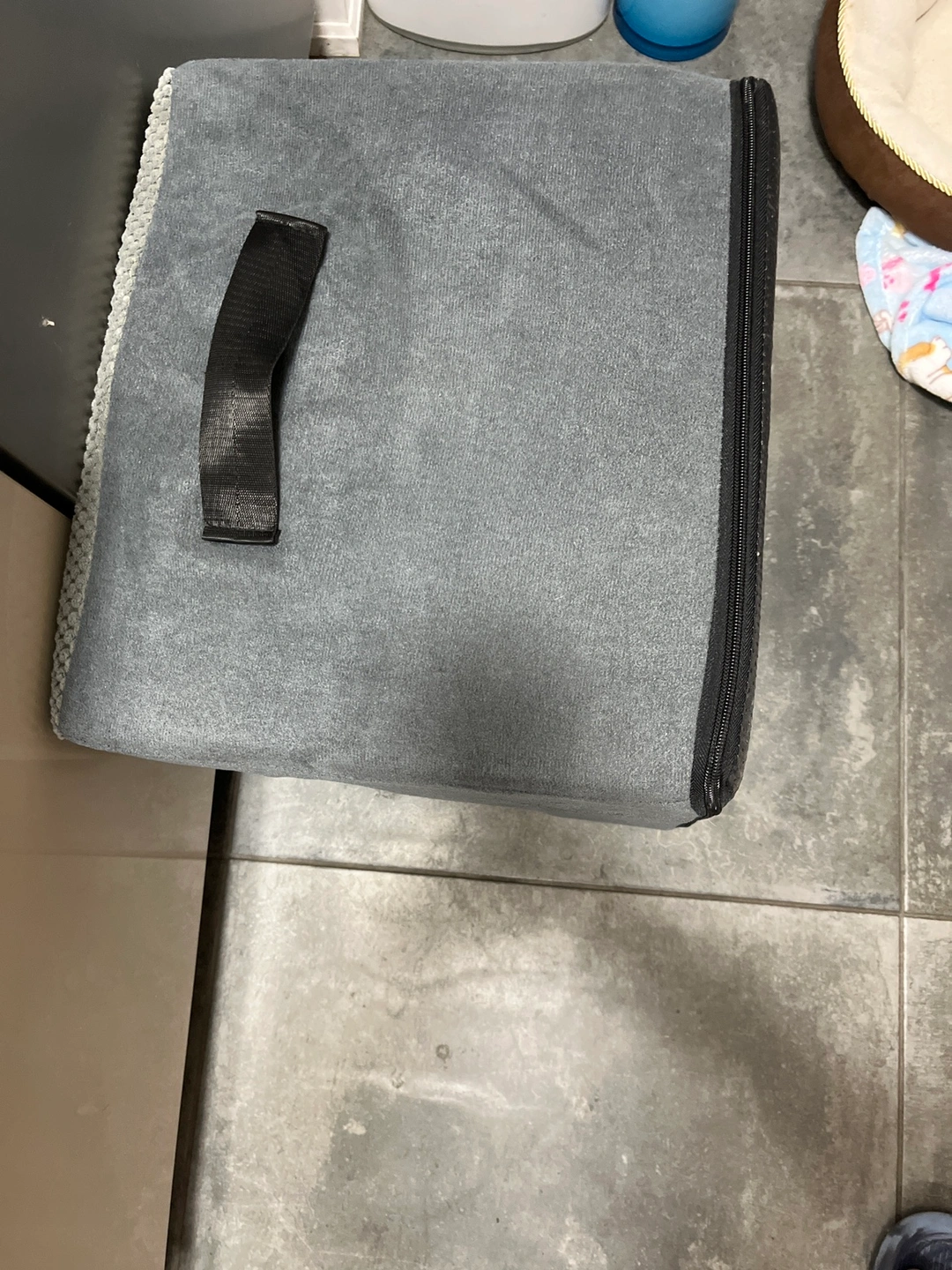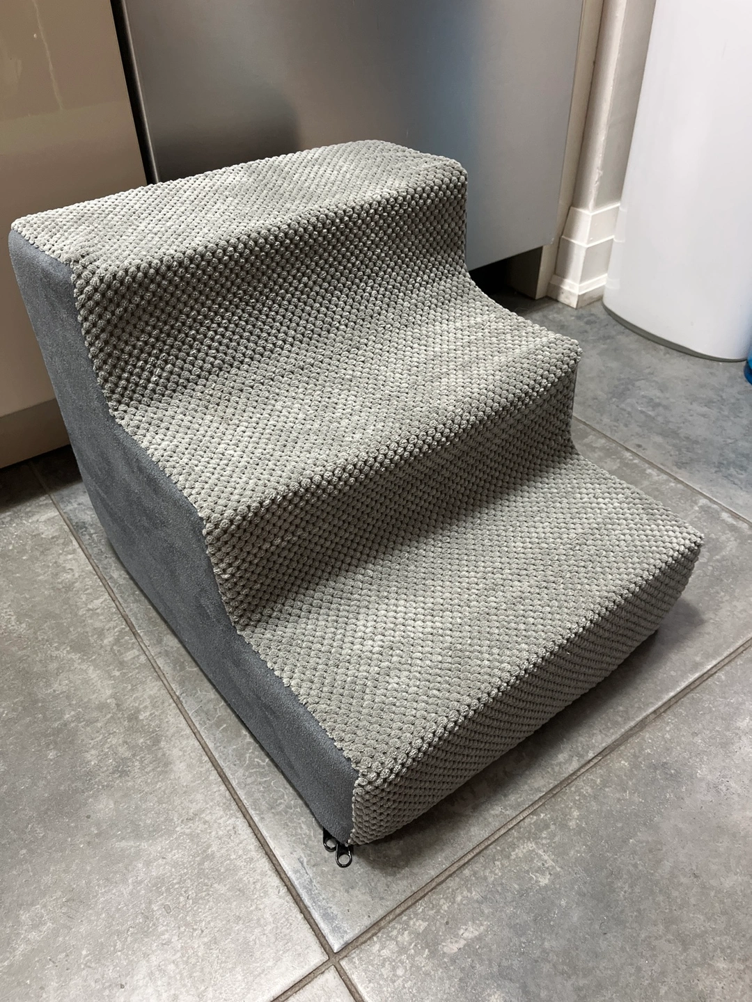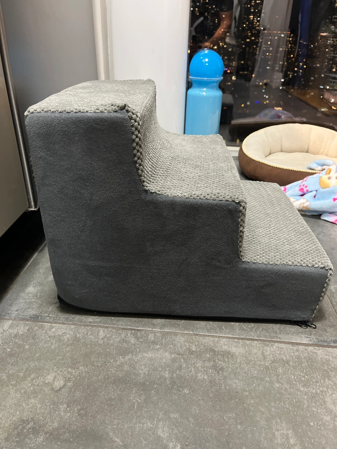 Three-step pet stairs with a grey fabric cover and a black handle. Dog stairs small dogs can help your pet reach the sofa or raised bed easily. [Anti Slip] [Multi Tier Design]: Multi step pet stairs perfect for your little pet to reach their favorite place. Dog steps can be placed beside the bed, sofa, car, etc., allowing pets to get up and down freely. The outermost layer is removable and washable for easy cleaning. Dog stairs ladder imade of high quality sponge and cloth material, soft and comfortable, it can protect your pet's paws and legs. Specification: Material: Sponge,Cloth 3 Step : 46cmx40cmx35cm/ 18.11inchx15.75inchx13.78inch High Density Foam Waterproof Folding Pet Stairs Dog Stairs Small Dogs Dog Ramp for Bed Couch cat stairs old cats tall puppy soft couch Ladder You can pick up by Carlton and Jarvis area