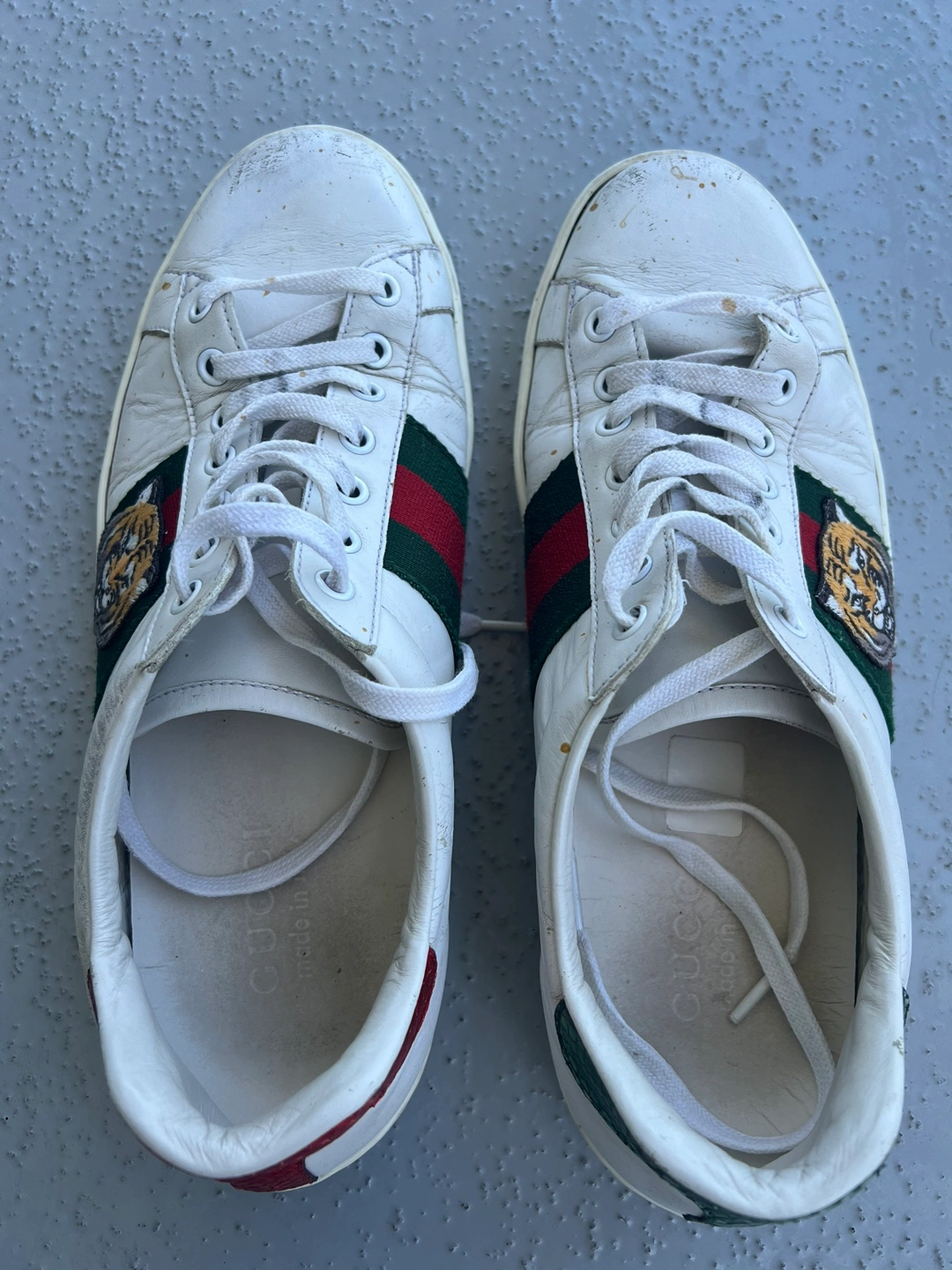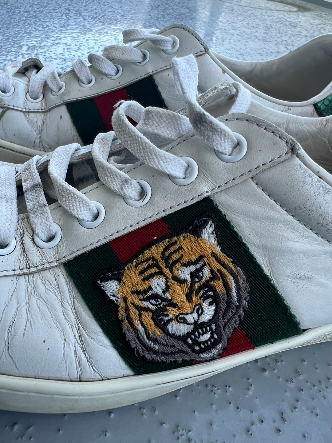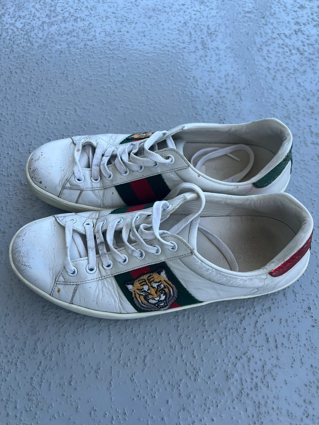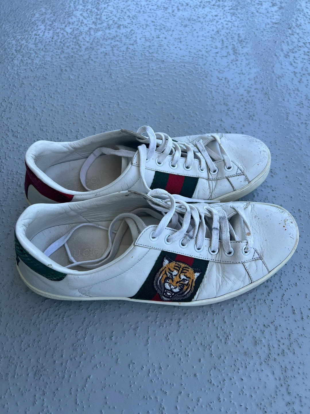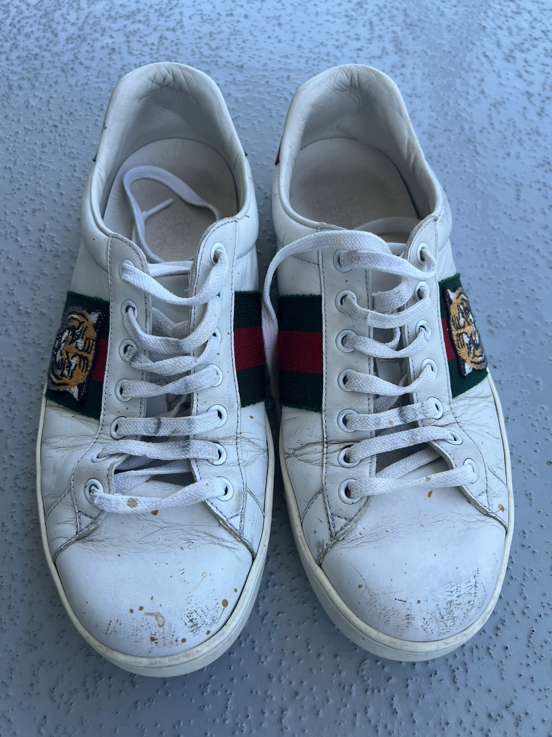 White leather sneakers with a tiger head design on the side. Features a green and red stripe. Size 41 Well used