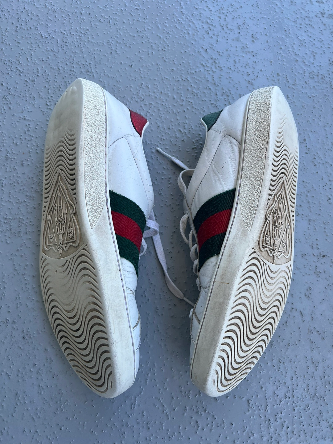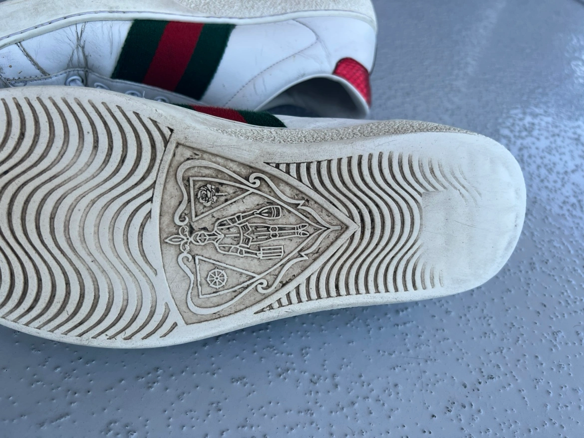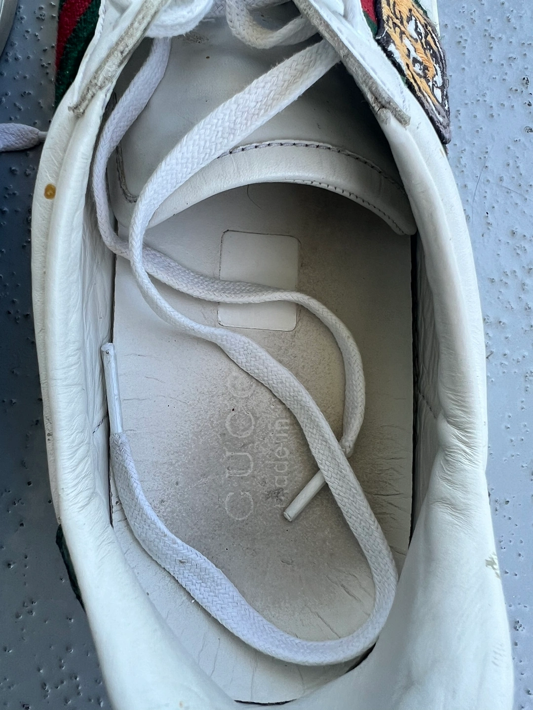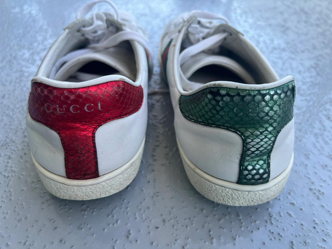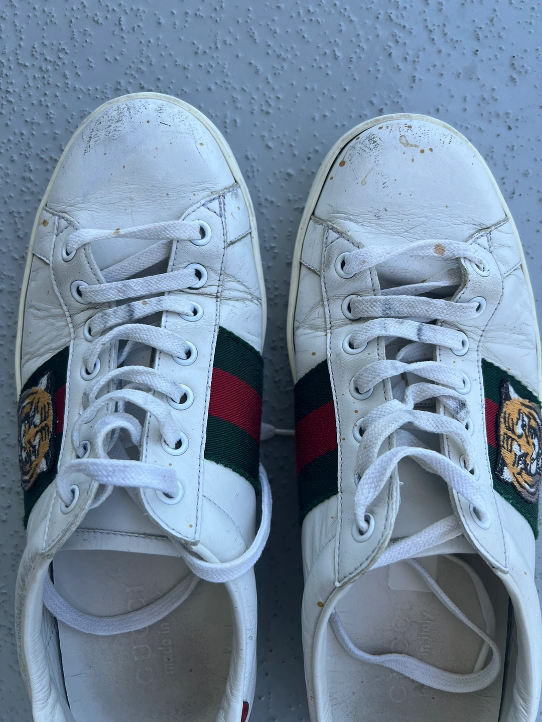 White leather sneakers with a tiger head design on the side. Features a green and red stripe. Size 41 Well used