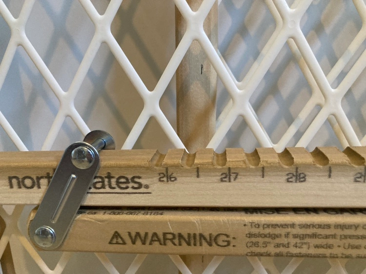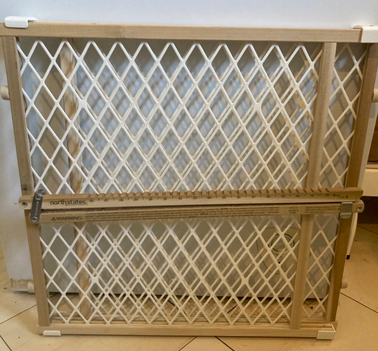 A white and wood door/stairway gate with an adjustable width from 26.5 to 42 inches. PU Kipling and Lakeshore