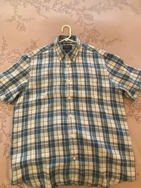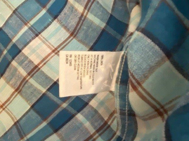 This is a teal green and white plaid short sleeve button down shirt. It has a small pocket on the left breast. Comes with extra buttons. Freshly laundered and from a pet and smoke free home. Pickup only in the St. Lawrence market area of downtown Toronto. Check out the other men’s shirts, ties, sandals, pants, T-shirts and ties in my listings. Pickup only in the St.Lawrence market area of downtown Toronto. Cash only.