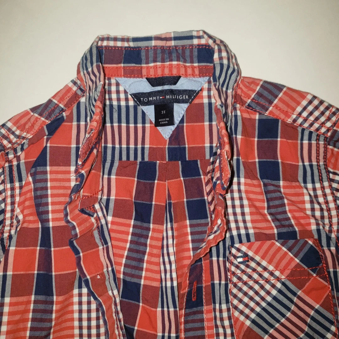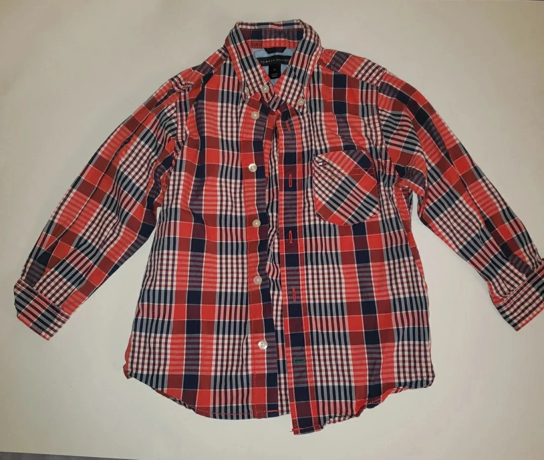 Red, white, and blue plaid long-sleeved button-up shirt with a single pocket. Size 3T. navy blue and white tommy Hilfiger shirt. size 3T