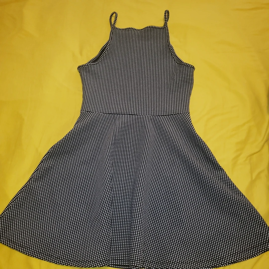 black skater dress with white polka dot patterns and a halter neckline. The dress is sleeveless and has a fitted bodice and also has a medium level of stretch.