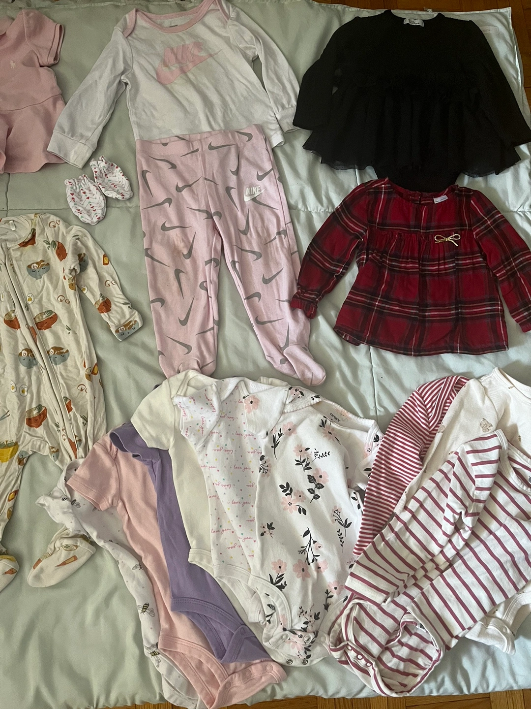 A bundle of baby girl clothes, sizes 0-12 months. Includes shirts, pants, dresses, and more.