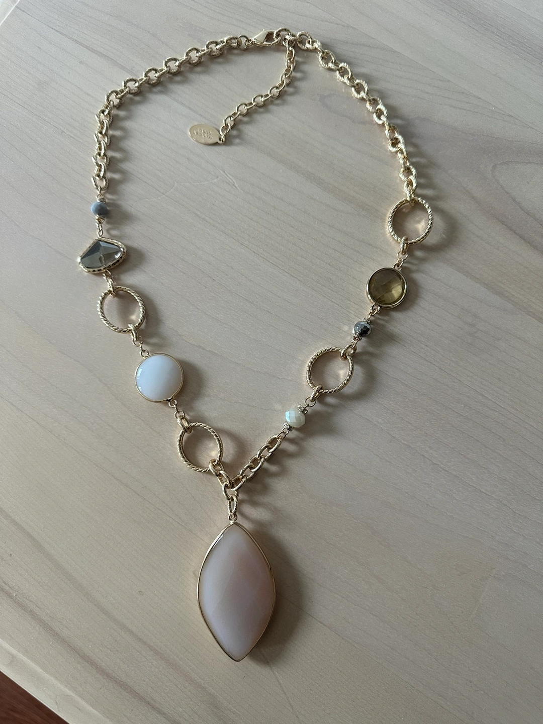 A beautiful gold chain necklace with a variety of stones and a large, light pink, teardrop-shaped pendant. Price firm.