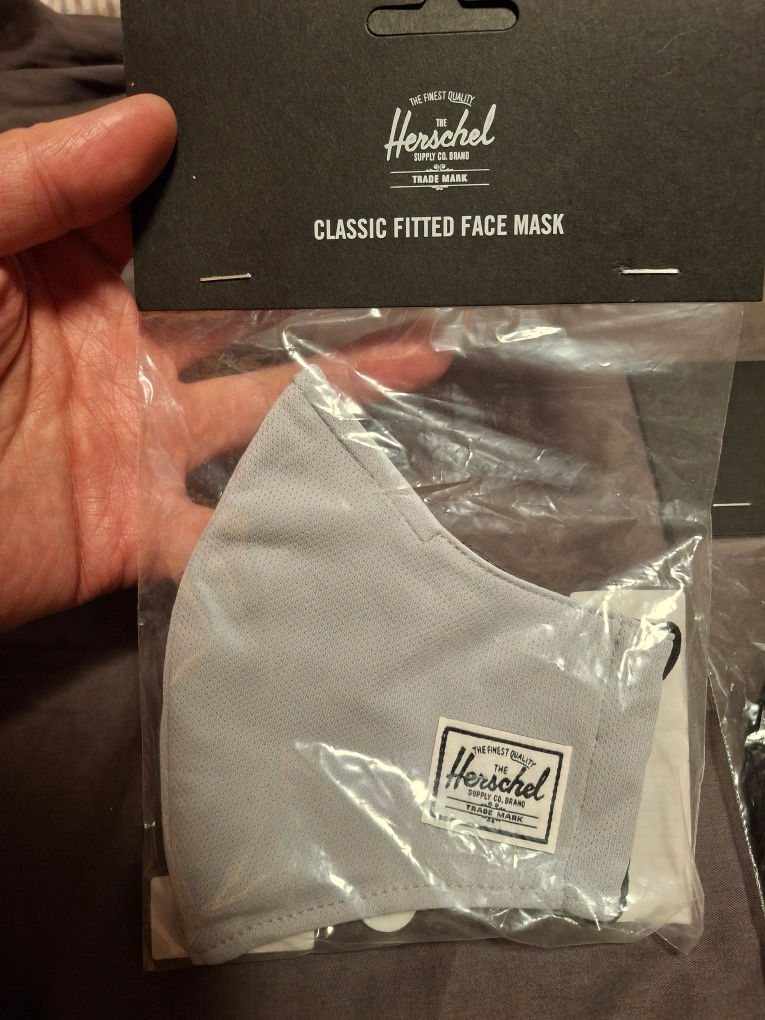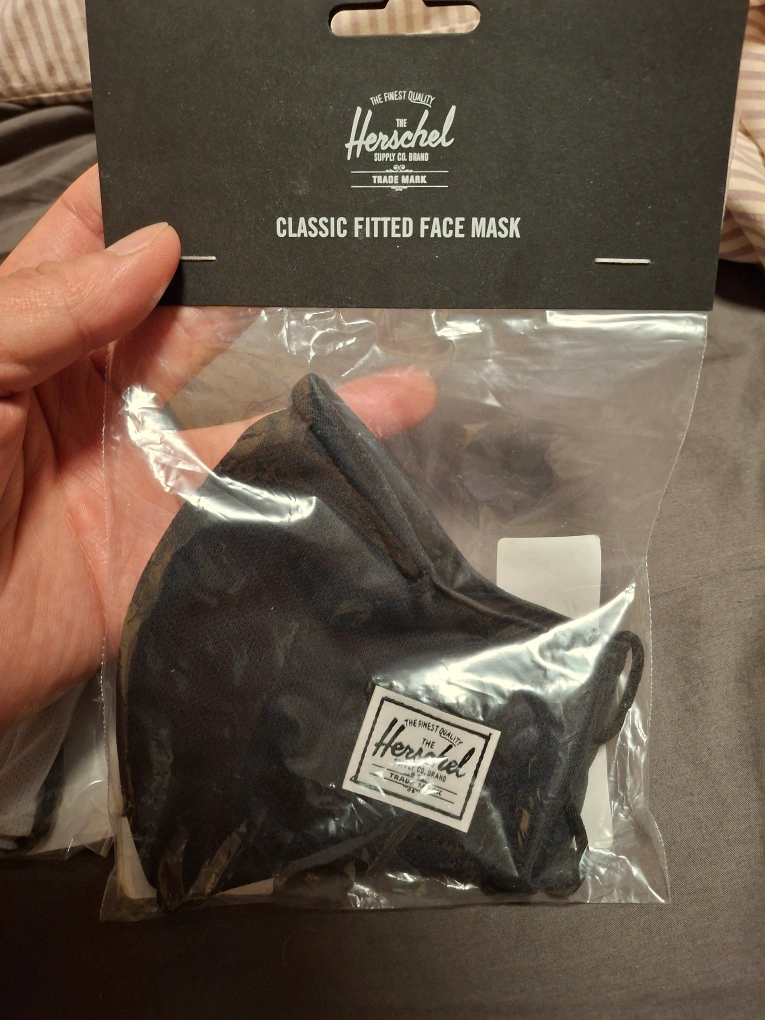 Set of two new Herschel Supply Co. face masks in black and grey, with adjustable straps and nose bridge. For both