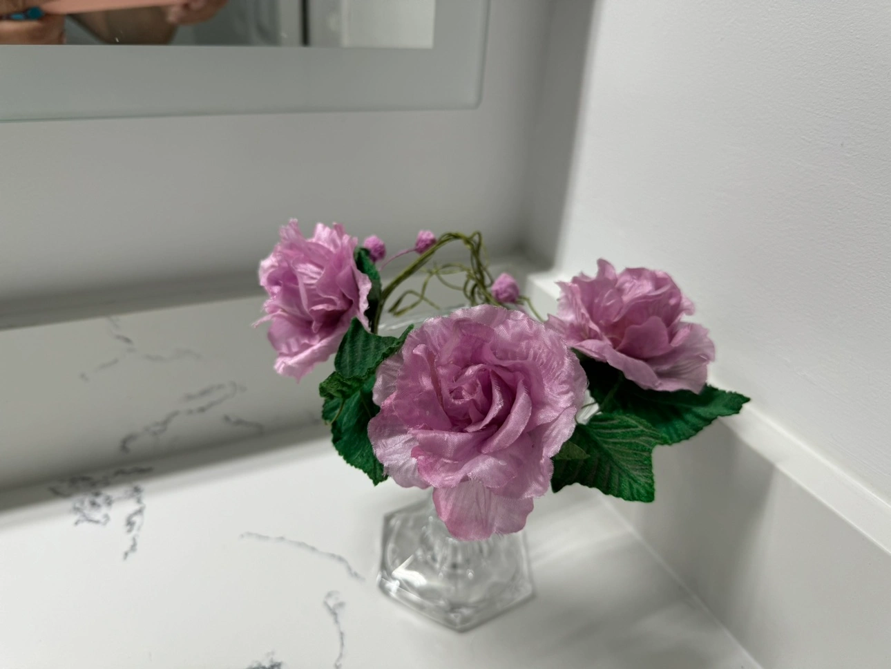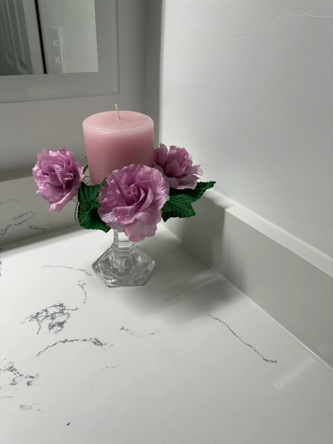 A beautiful glass candle holder with artificial roses around the top. This is a great piece for adding a touch of elegance to your home. Pick up at Steeles and Bathust , North York.