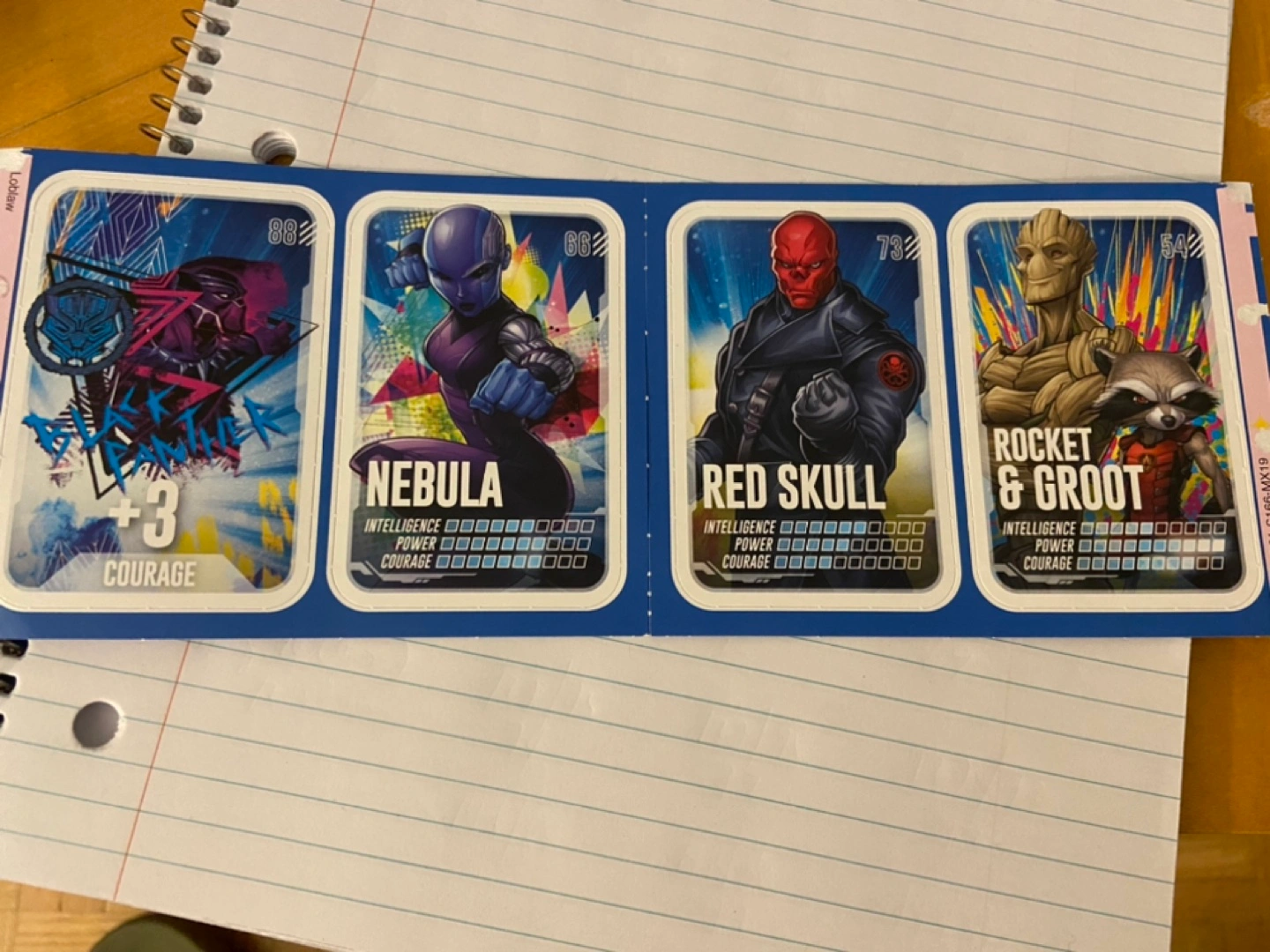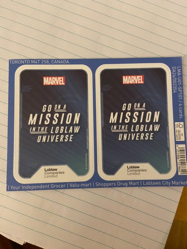 Four trading cards from the Marvel Go on a Mission in the Loblaw Universe set. Only available for pick up.