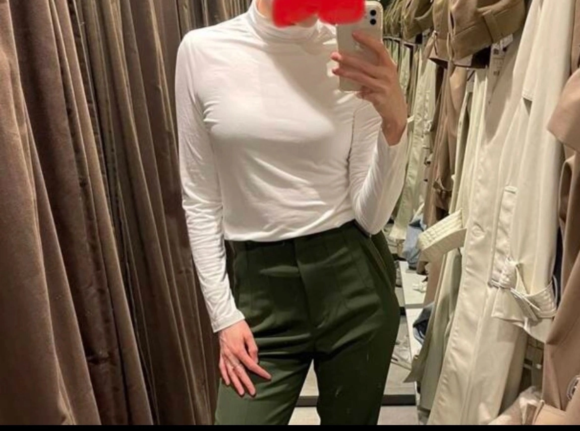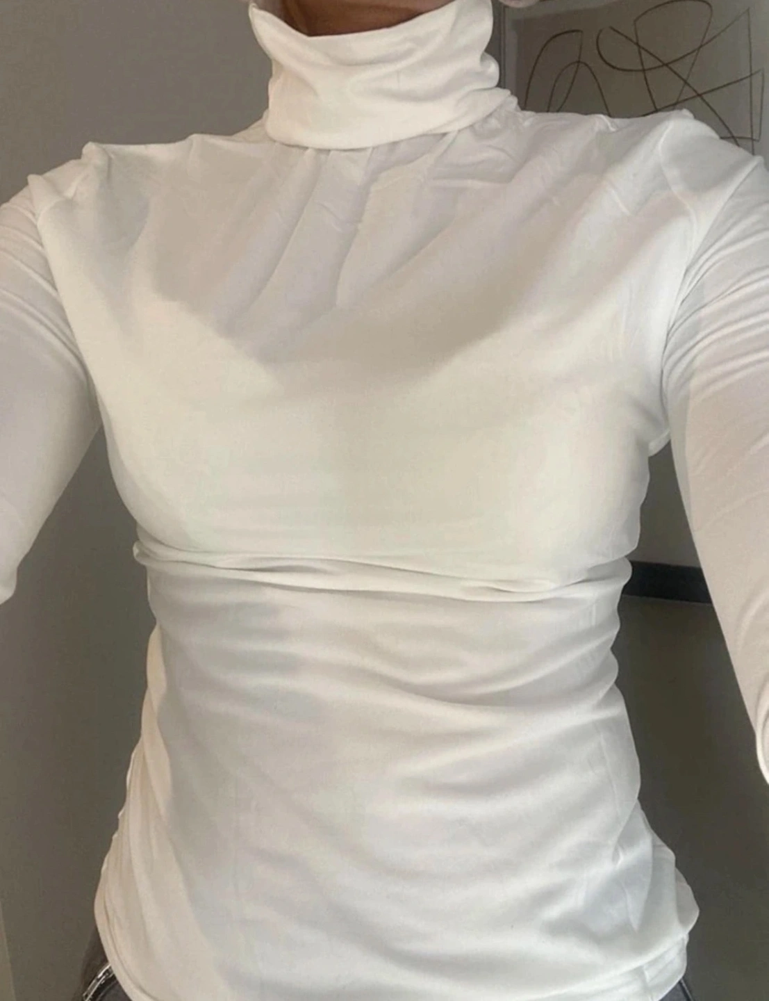 A white long-sleeved turtleneck top. It is a fitted style. It is made of a soft, stretchy fabric.
