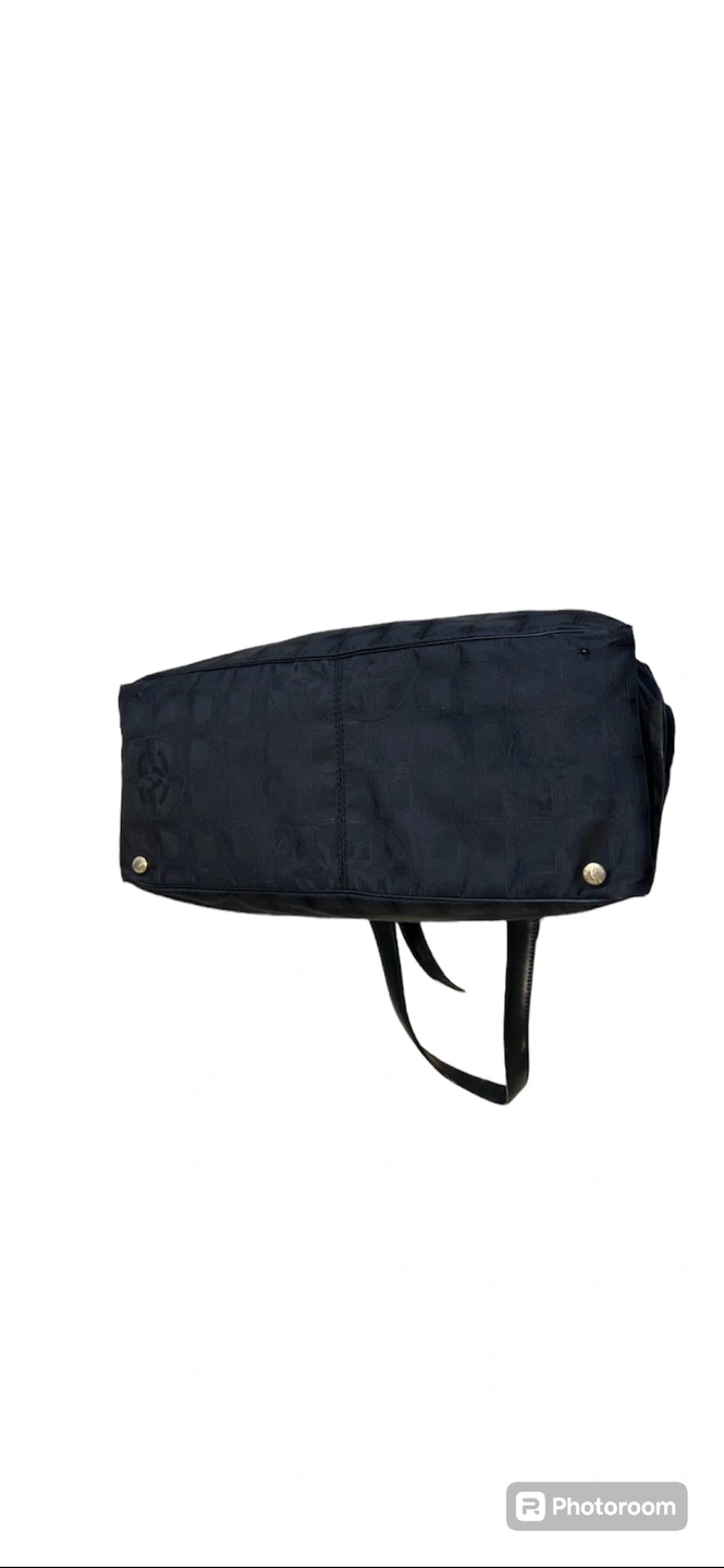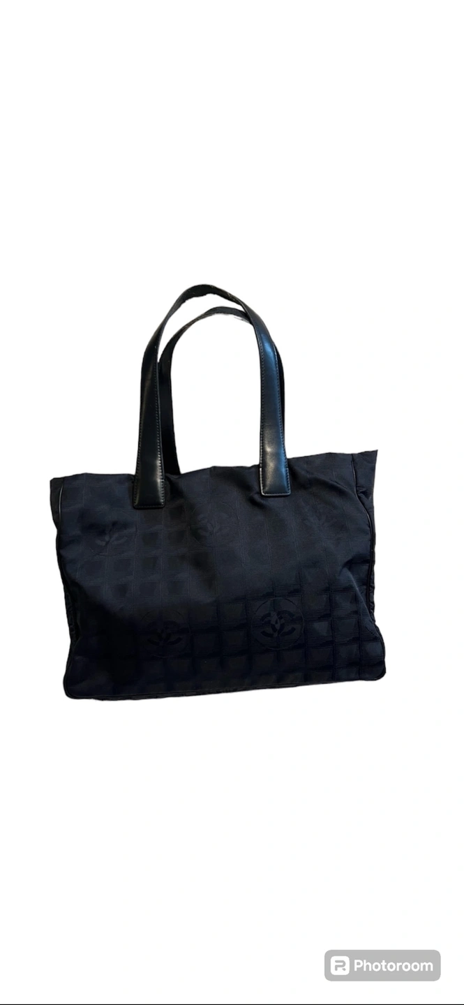 This is a stylish Chanel tote bag. It is in black nylon with leather handles. It has 2 interior zipper pockets. It is a great size for everyday use at work, when ur out and about and for travelling. Some flaws to note are 2 missing feet (prongs) at the bottom and there are some wear to the straps and is reflected in the price. This would be PERFECT for a FIRST Chanel bag without the high crazy price! Comes as is